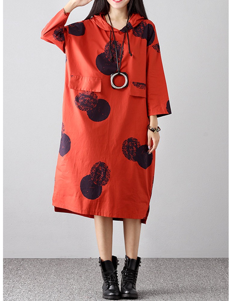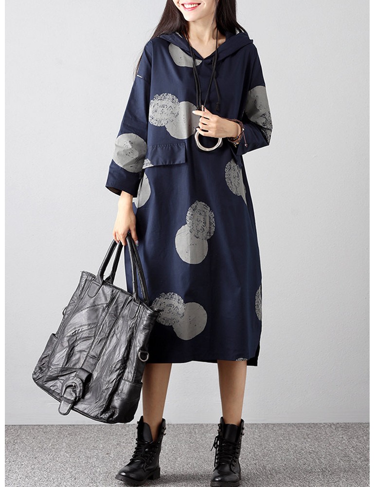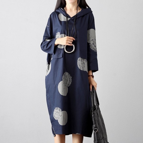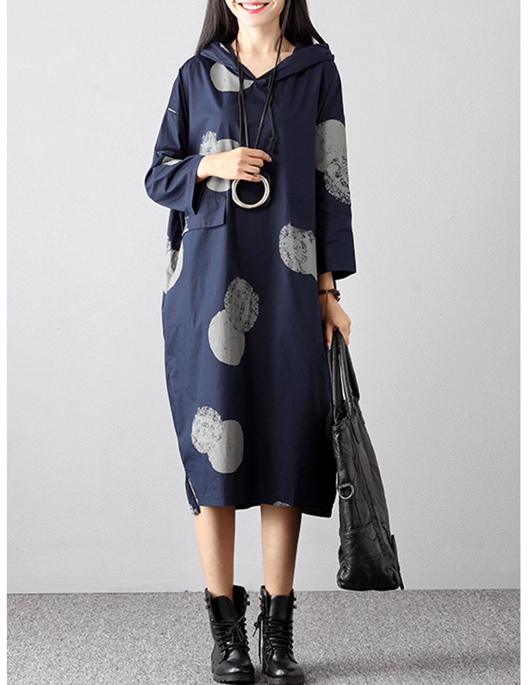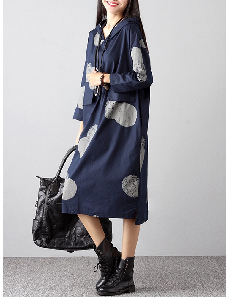 Casual Polka Dot Print Irregular Hem Hooded Long Sleeve Women Dresses