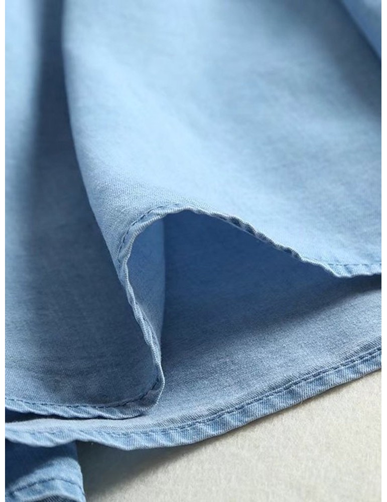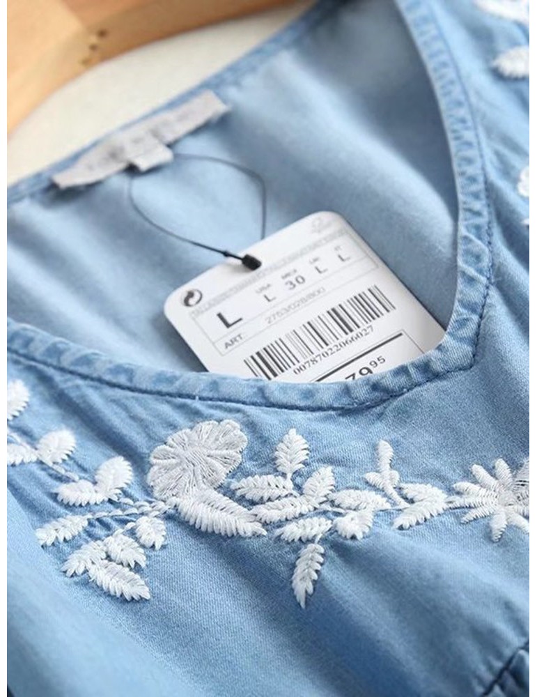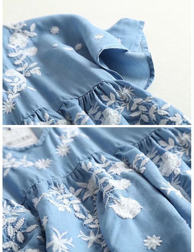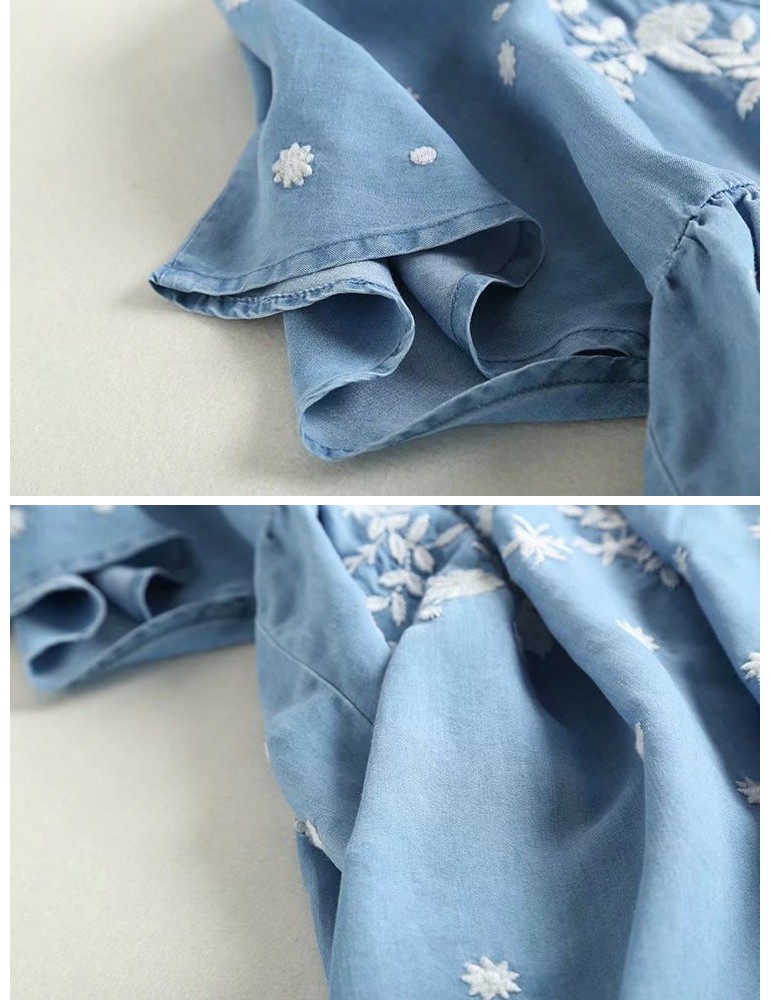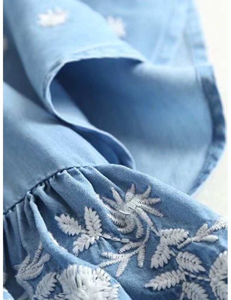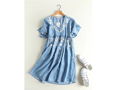 Denim Embroidery Short Sleeve V-neck Casual Dresses