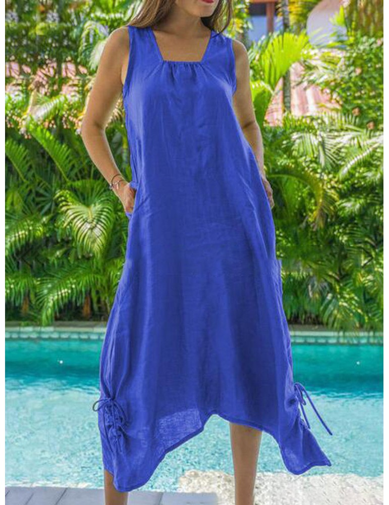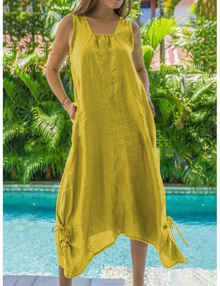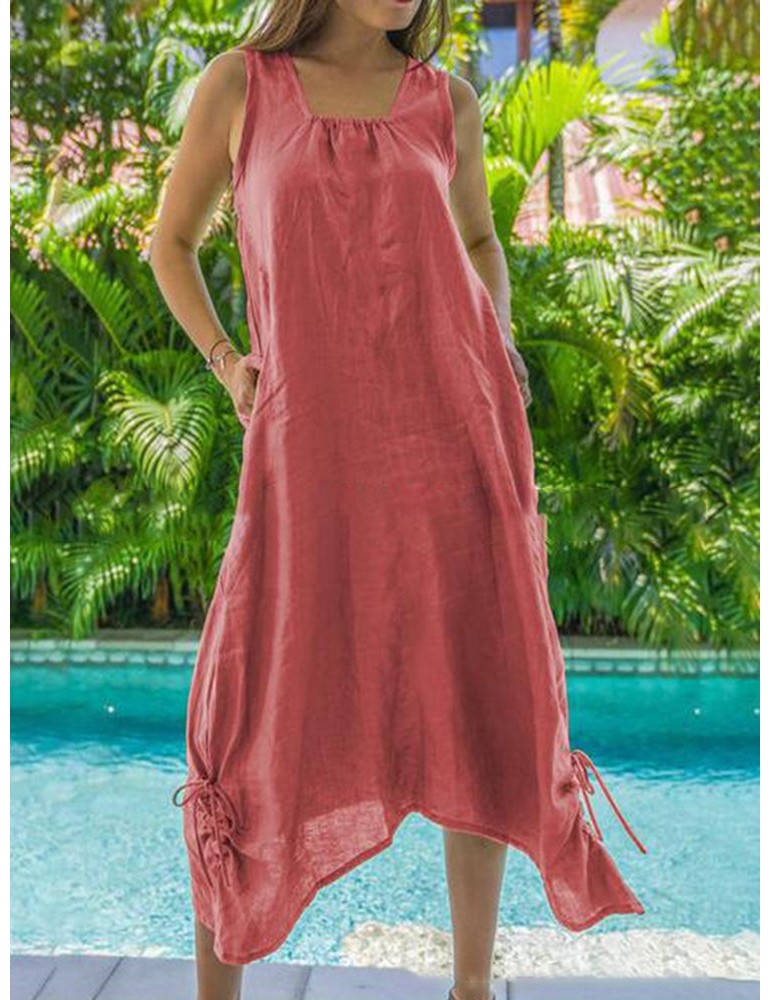 Vintage Solid Color Asymmetrical Hem Drawstring Dress