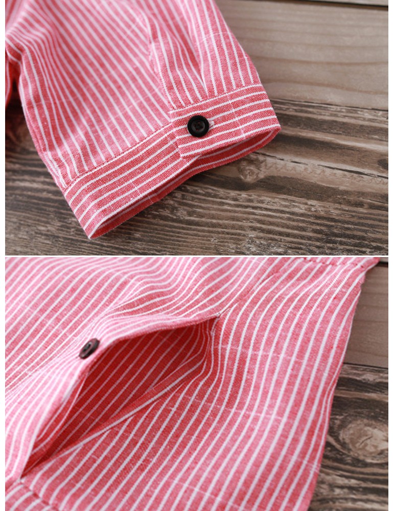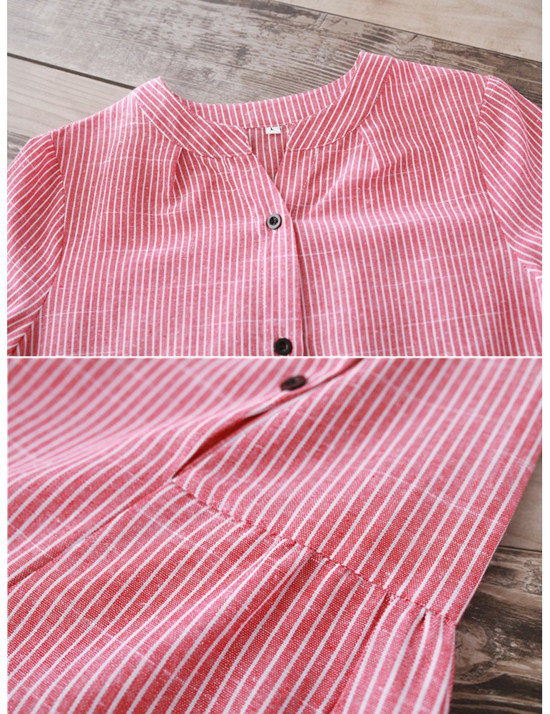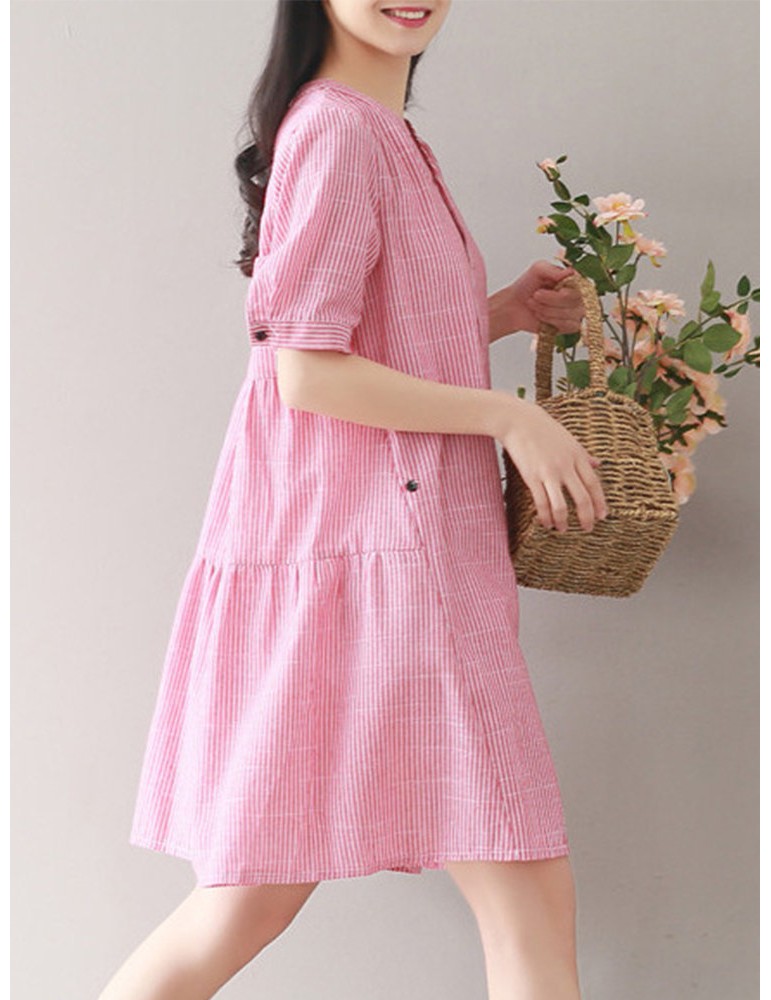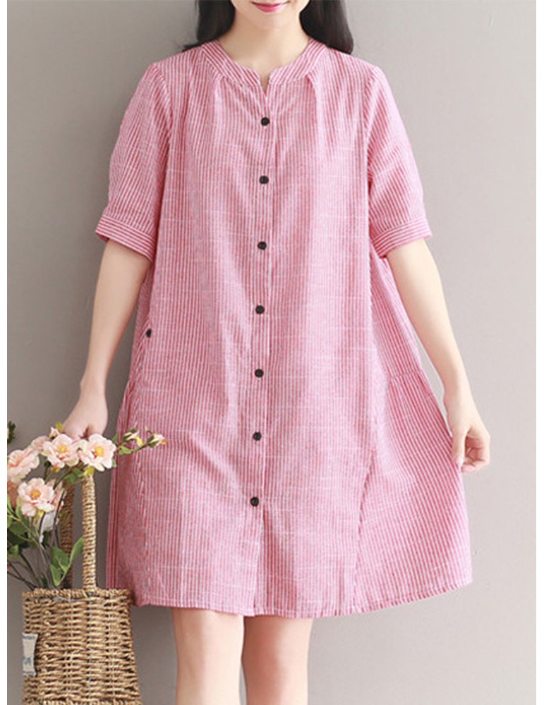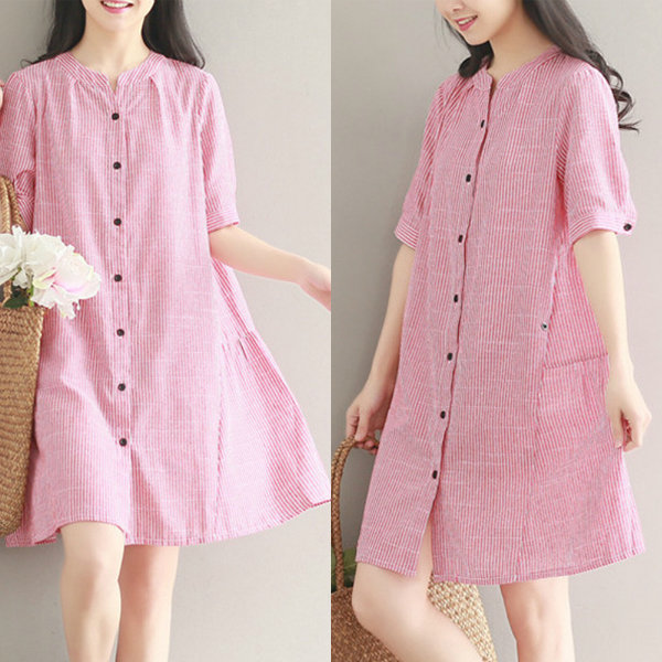 Women Stripe Vintage Short Sleeve Shirt Dresses