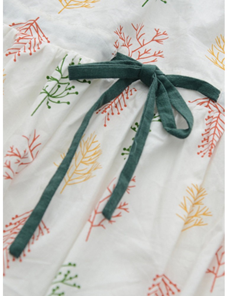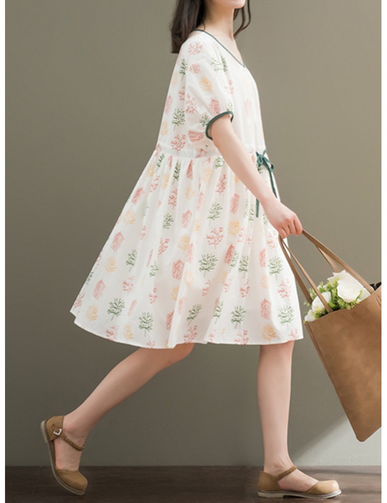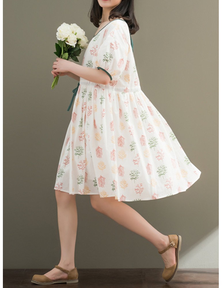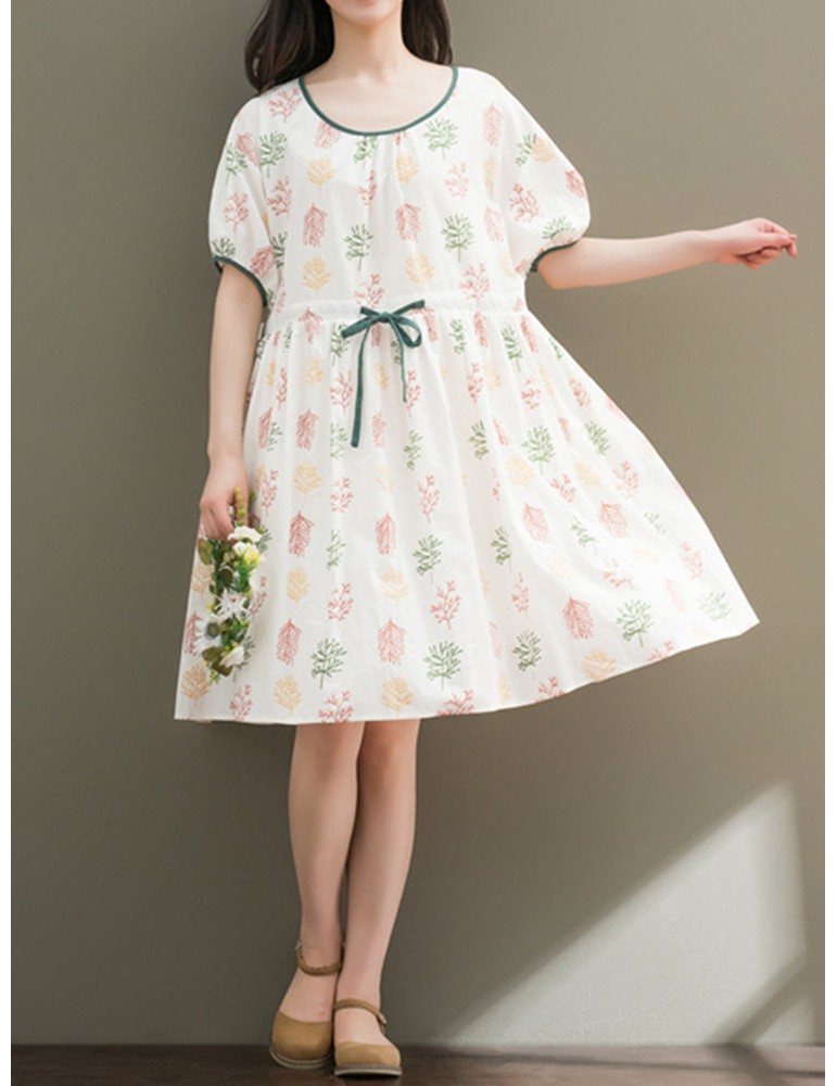 Vintage Women Trees Printed Drawstring Short Sleeve Dresses
