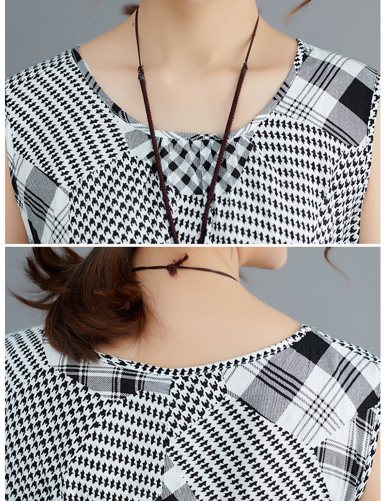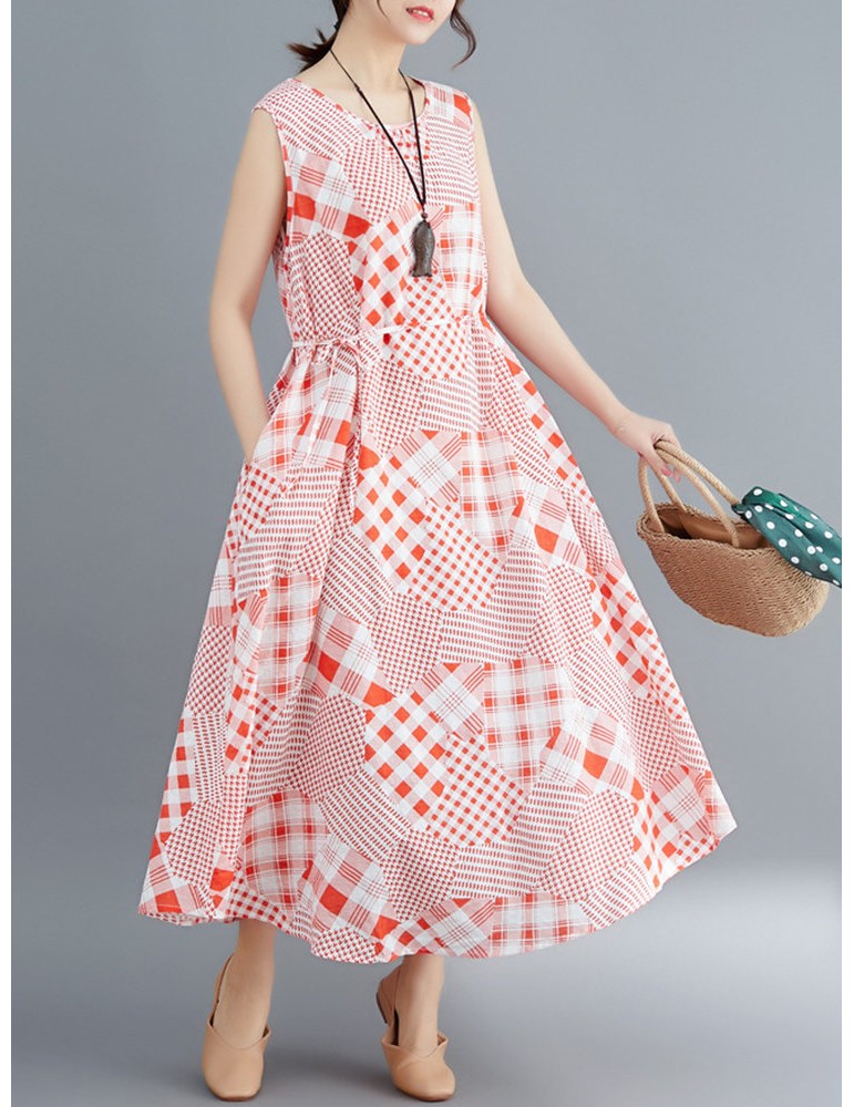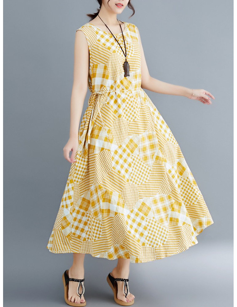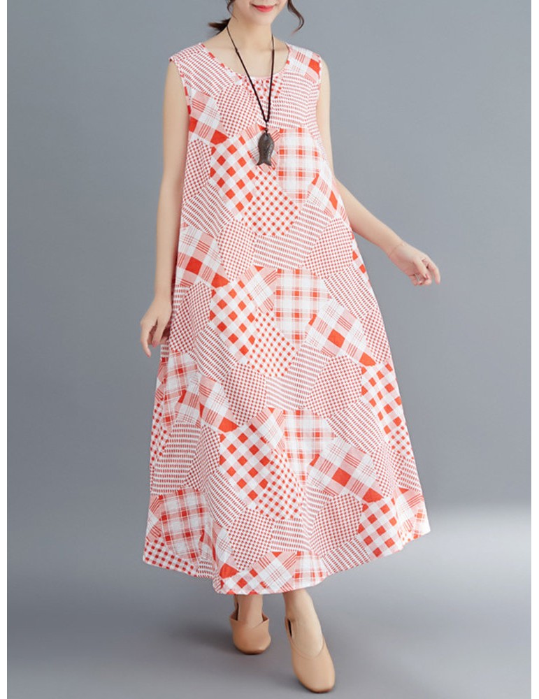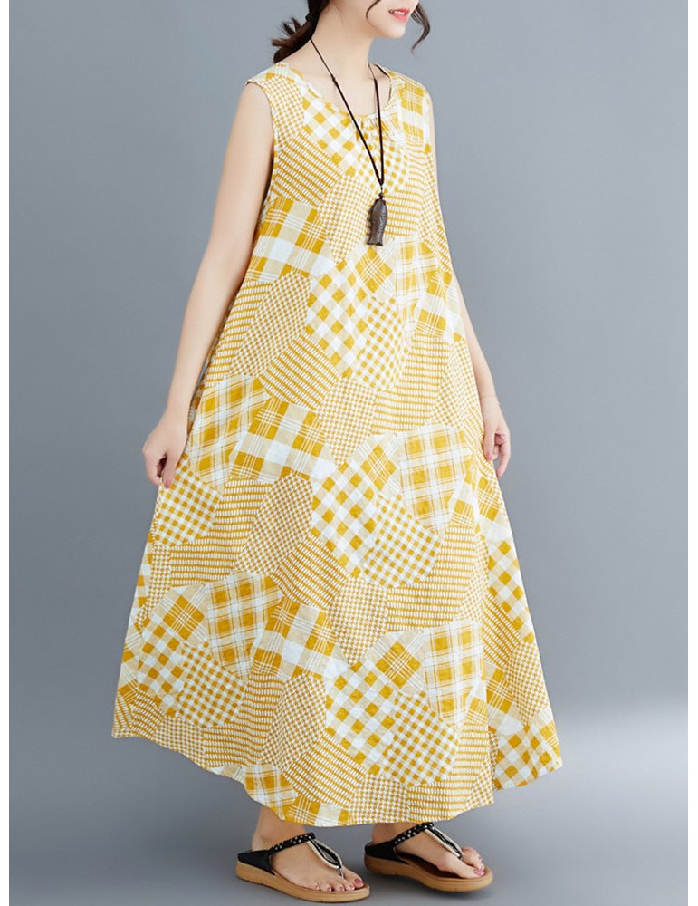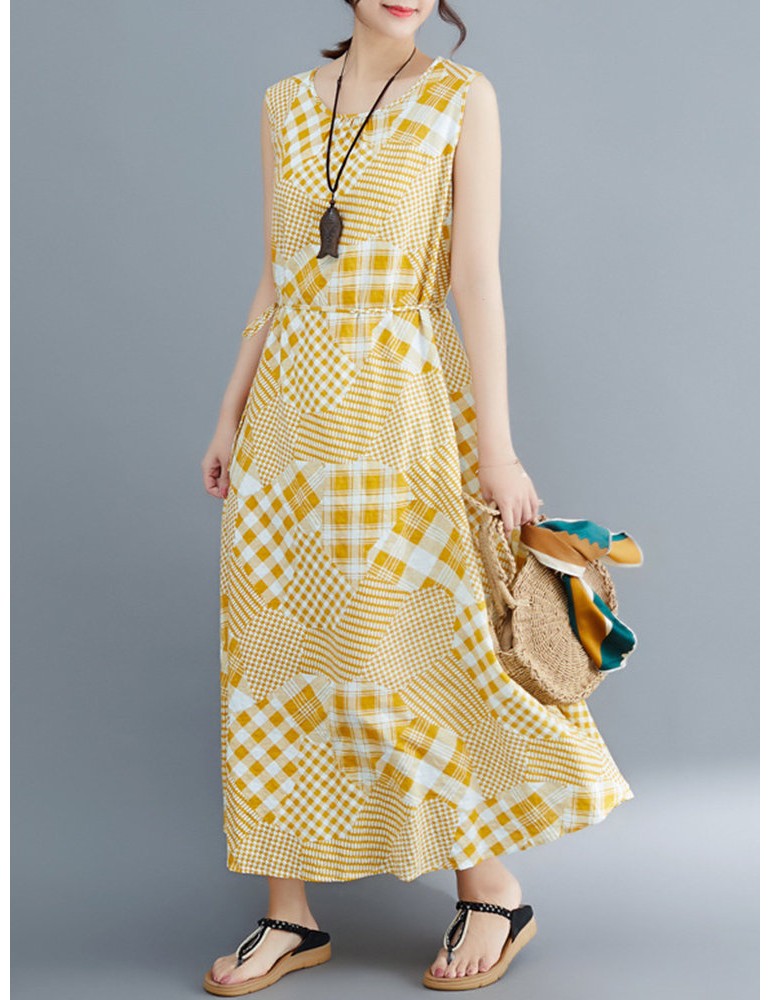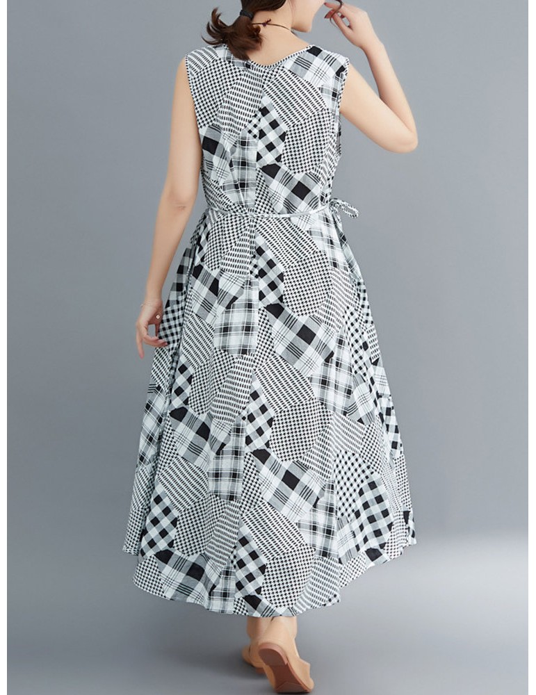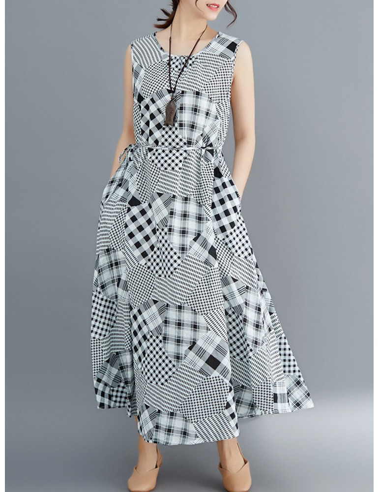 Print Patch Check Sleeveless Crew Neck Casual Dress