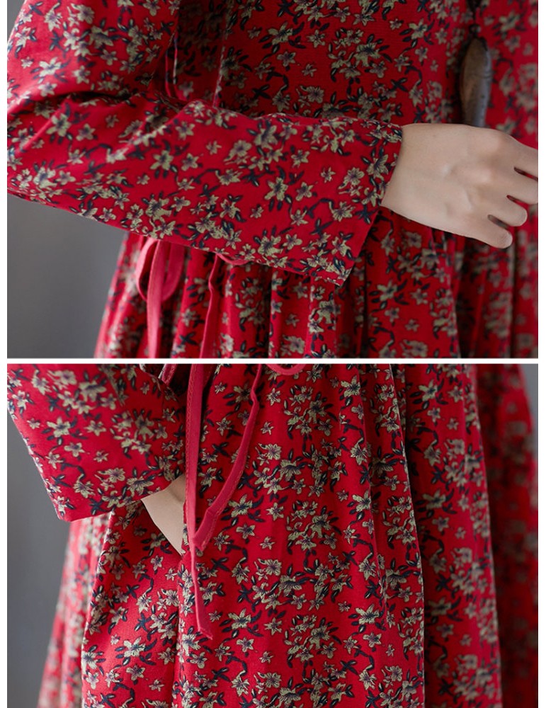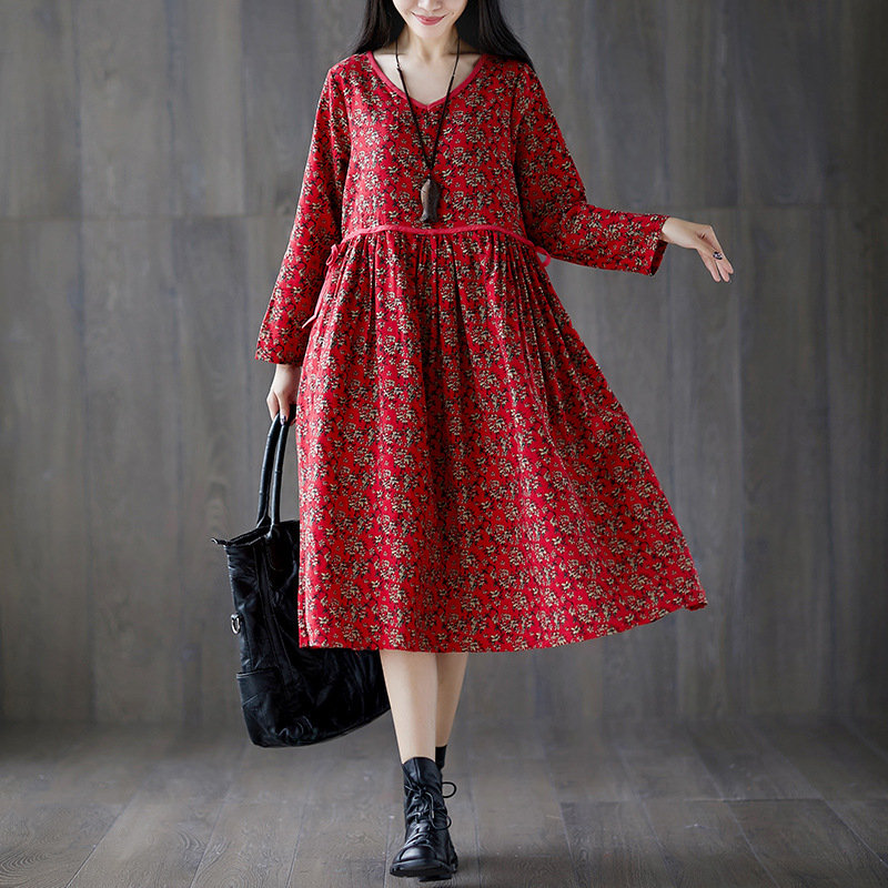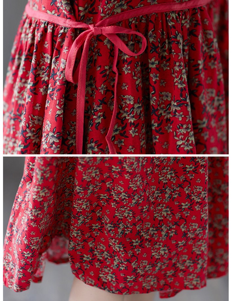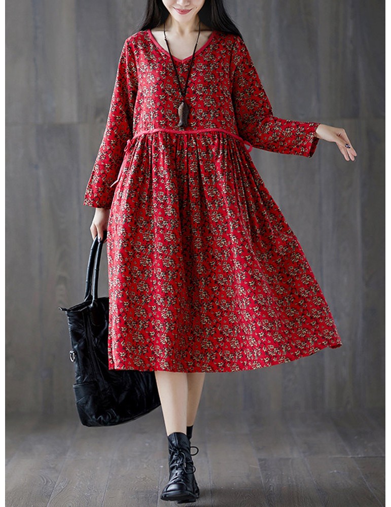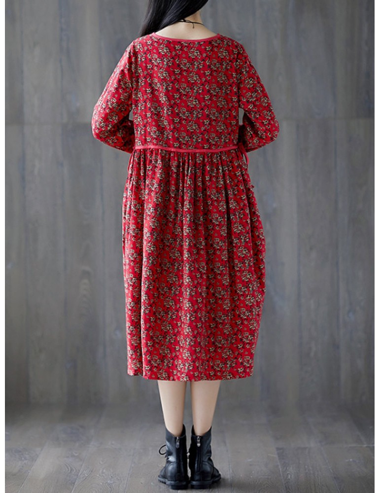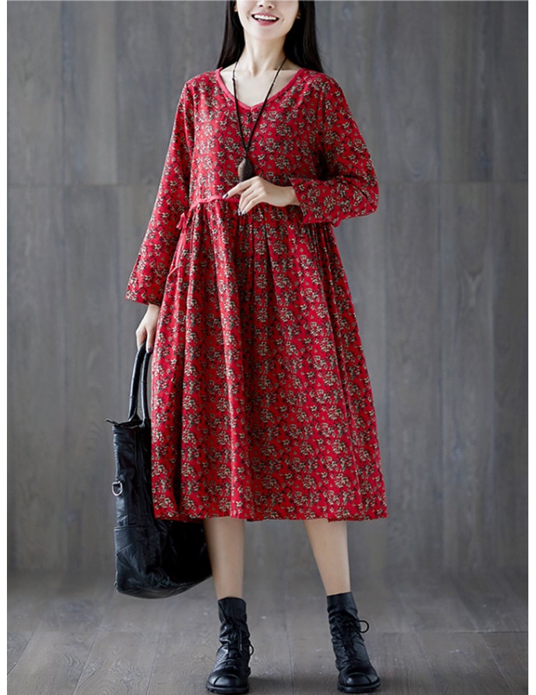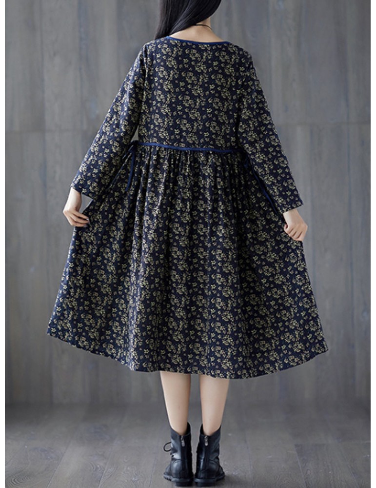 Tie Waist Floral Print Loose Long Sleeve Vintage Dresses