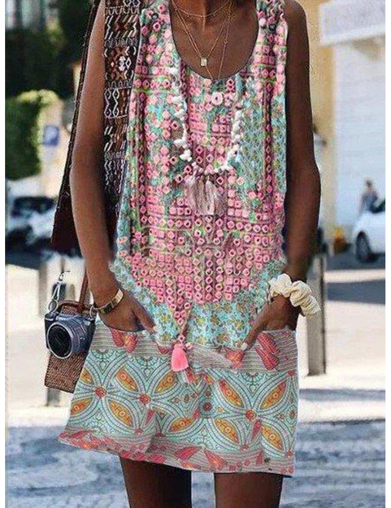 Bohemian Sleeveless Print Floral Crew Neck Summer Dress
