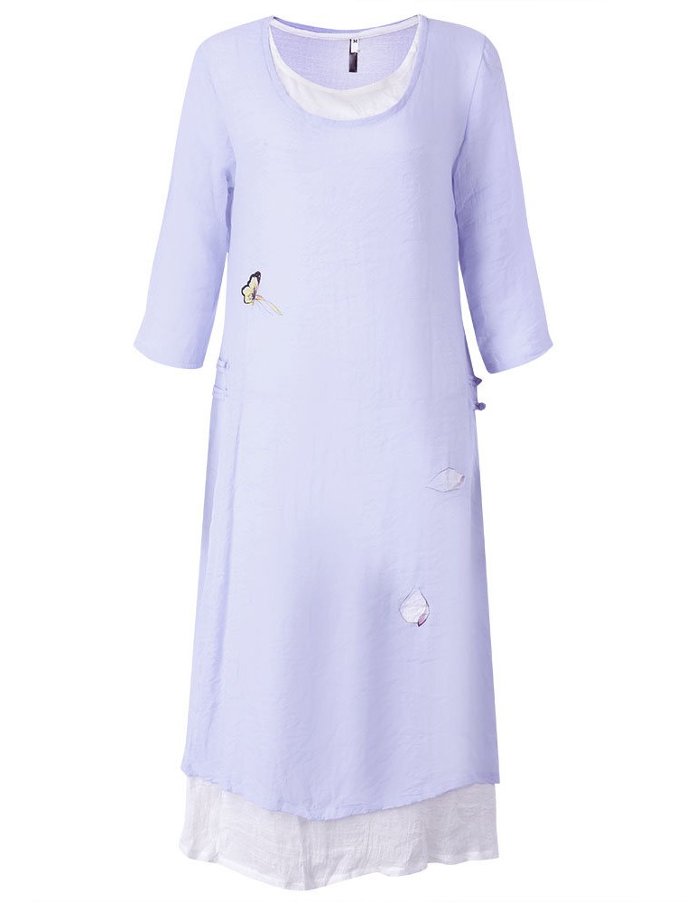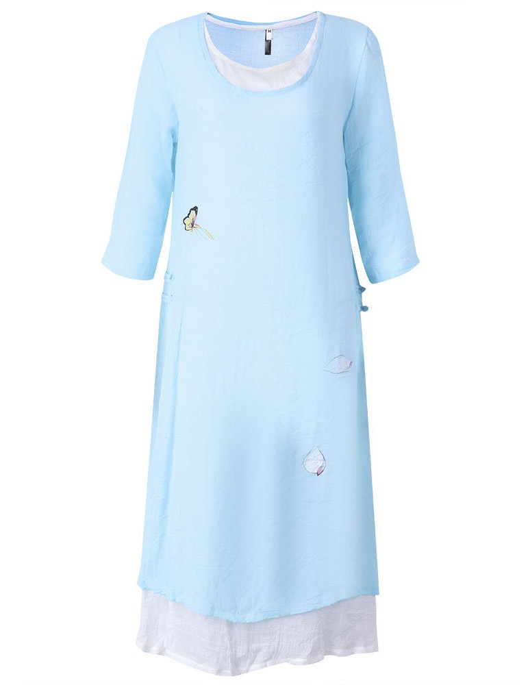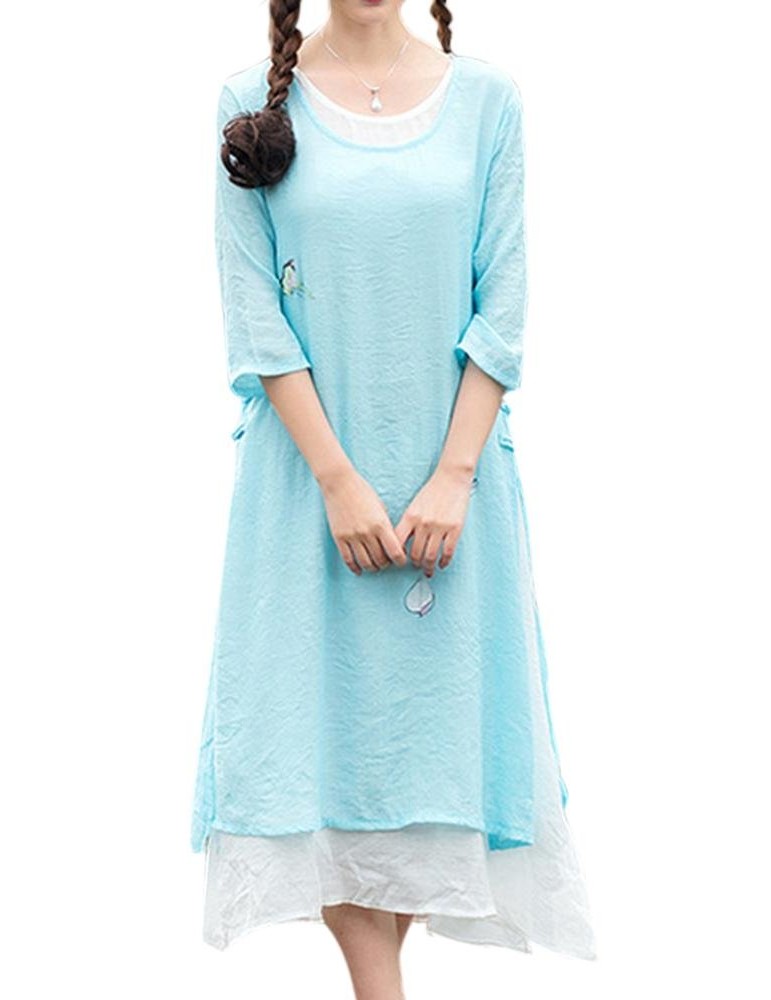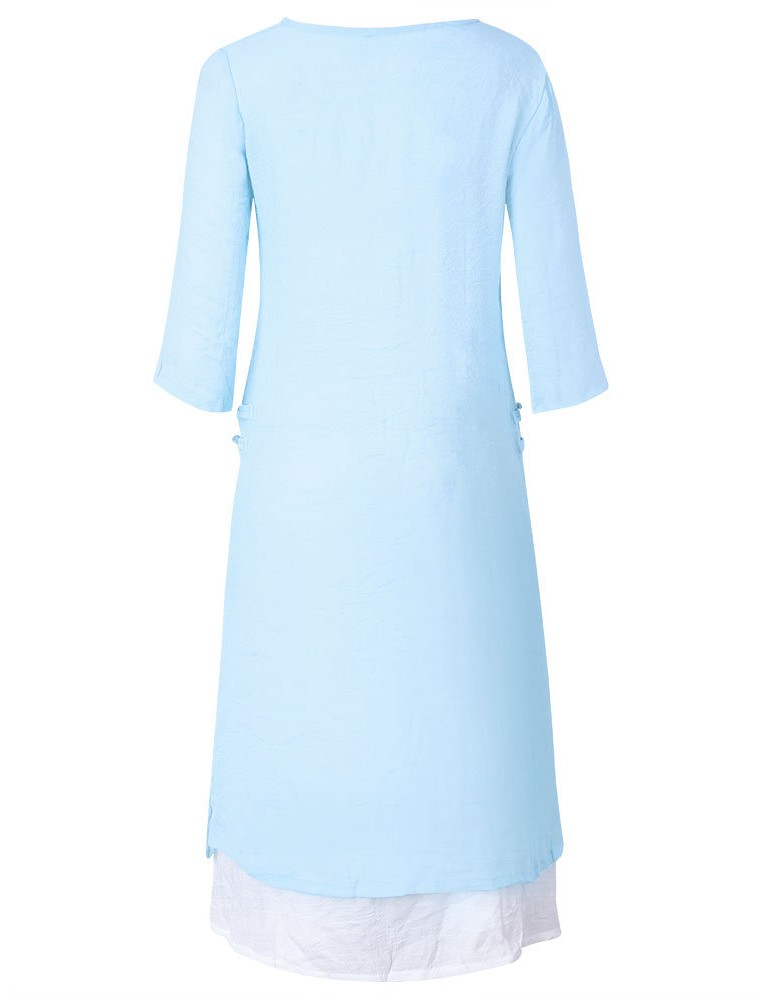 Women 3/4 Sleeve Fake Two Pieces Printed Split Vintage Maxi Dress