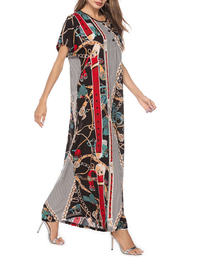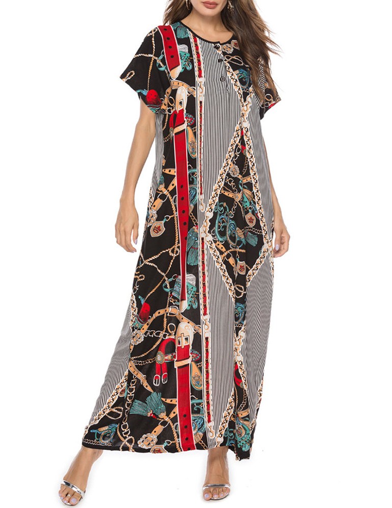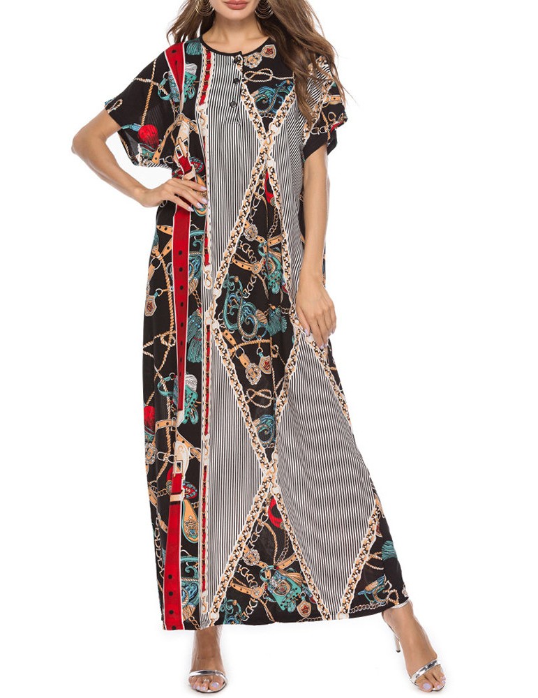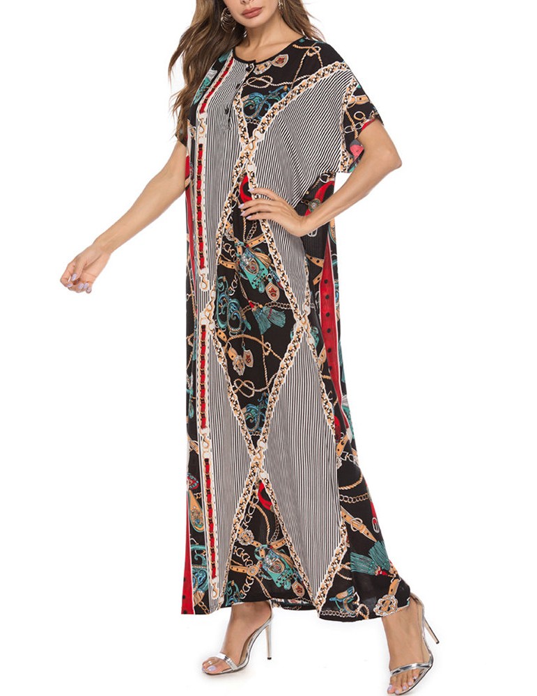 Vintage Asymmetric Print Batwing Sleeve Overhead Maxi Dress