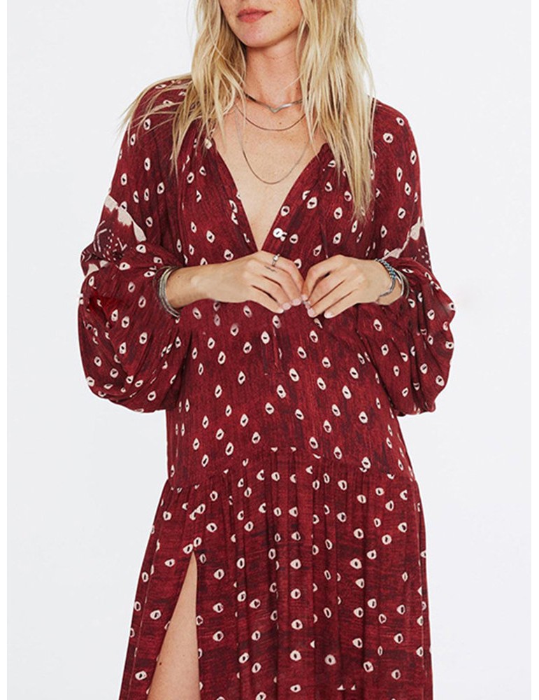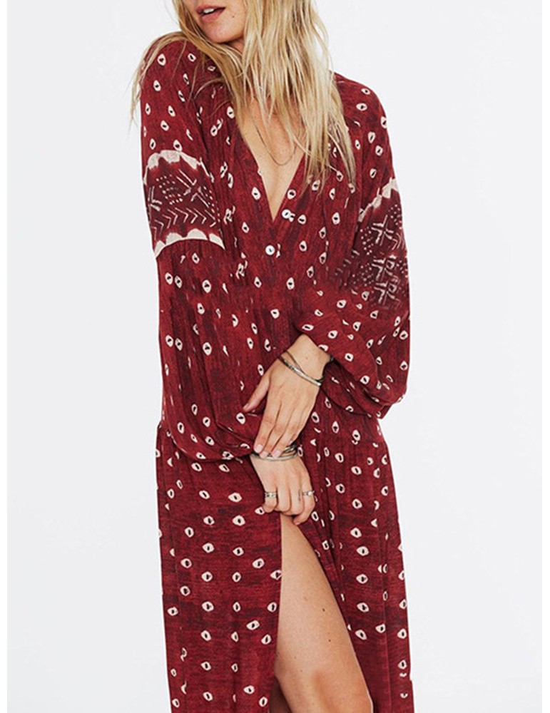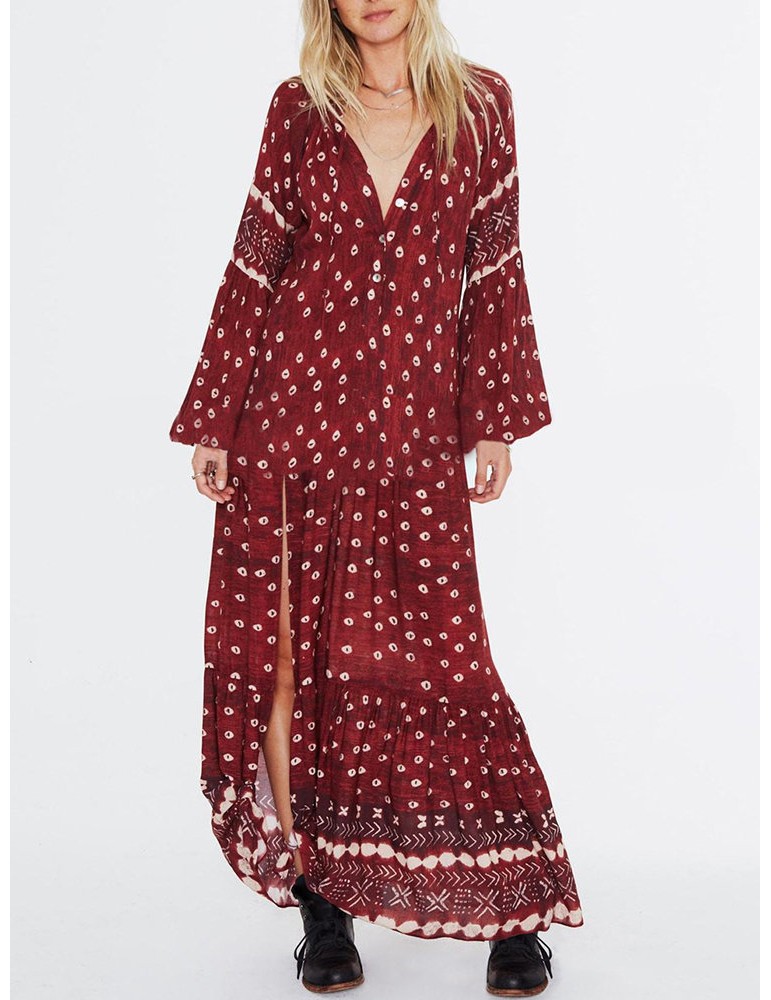 Women Ethnic Print Splited Long Sleeve Vintage Maxi Dress
