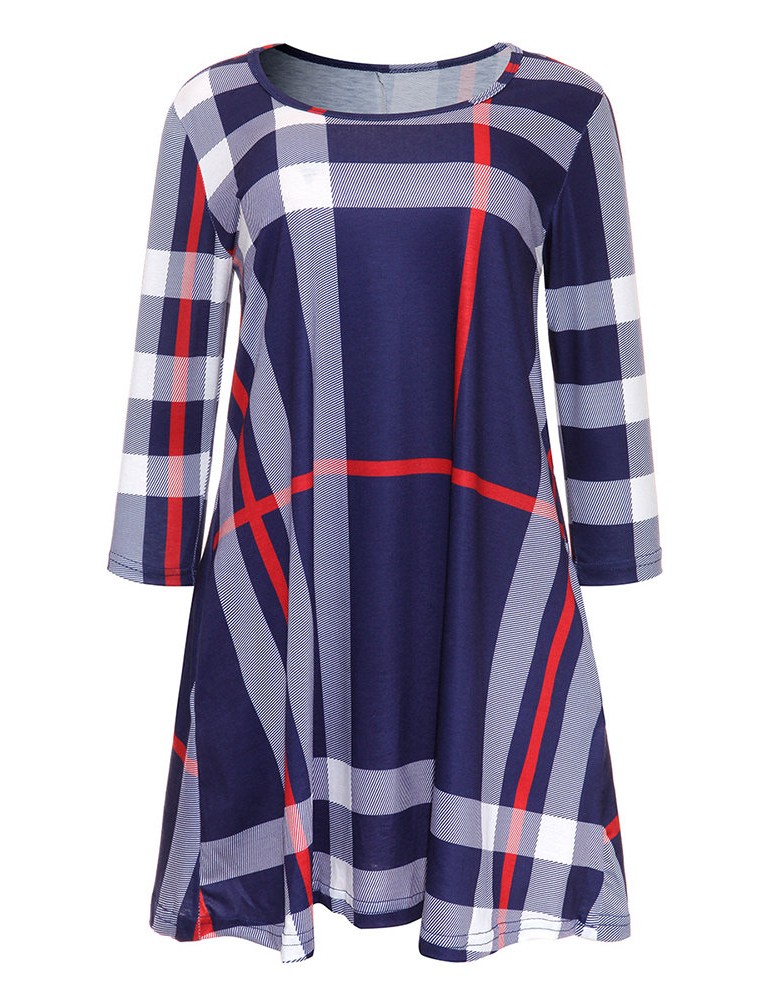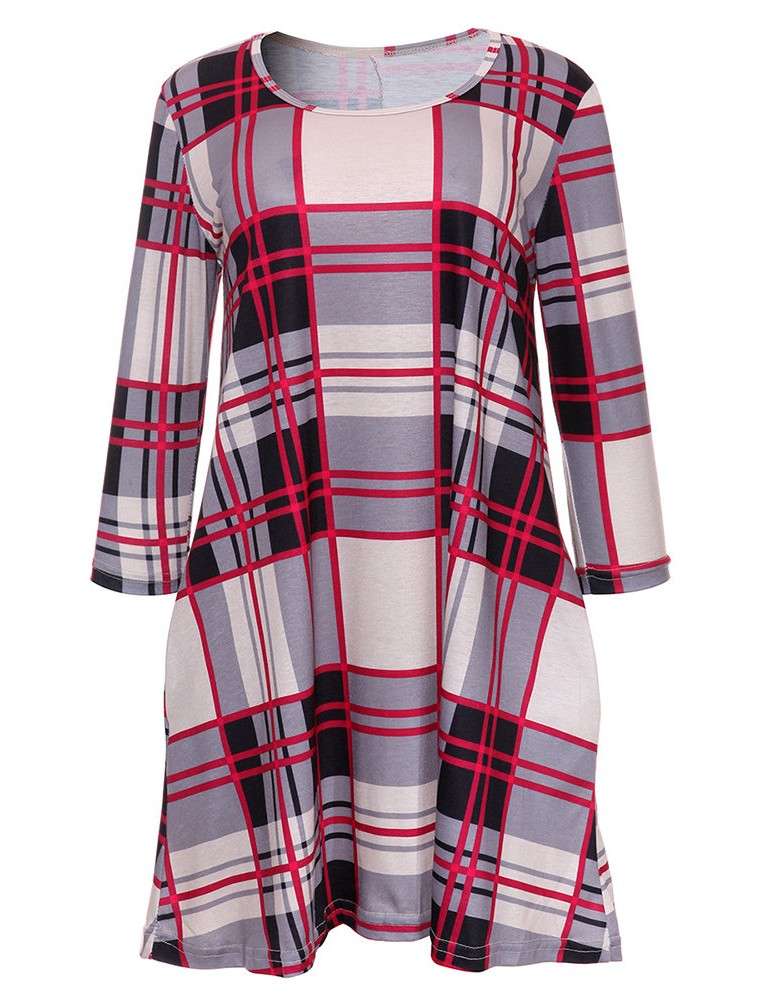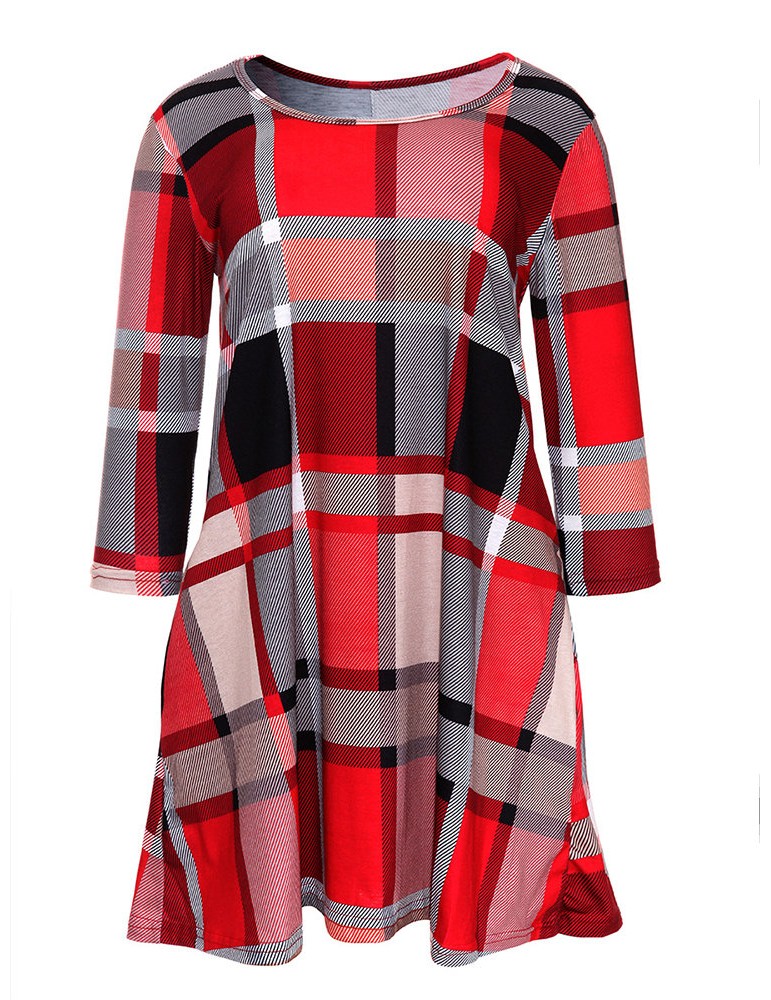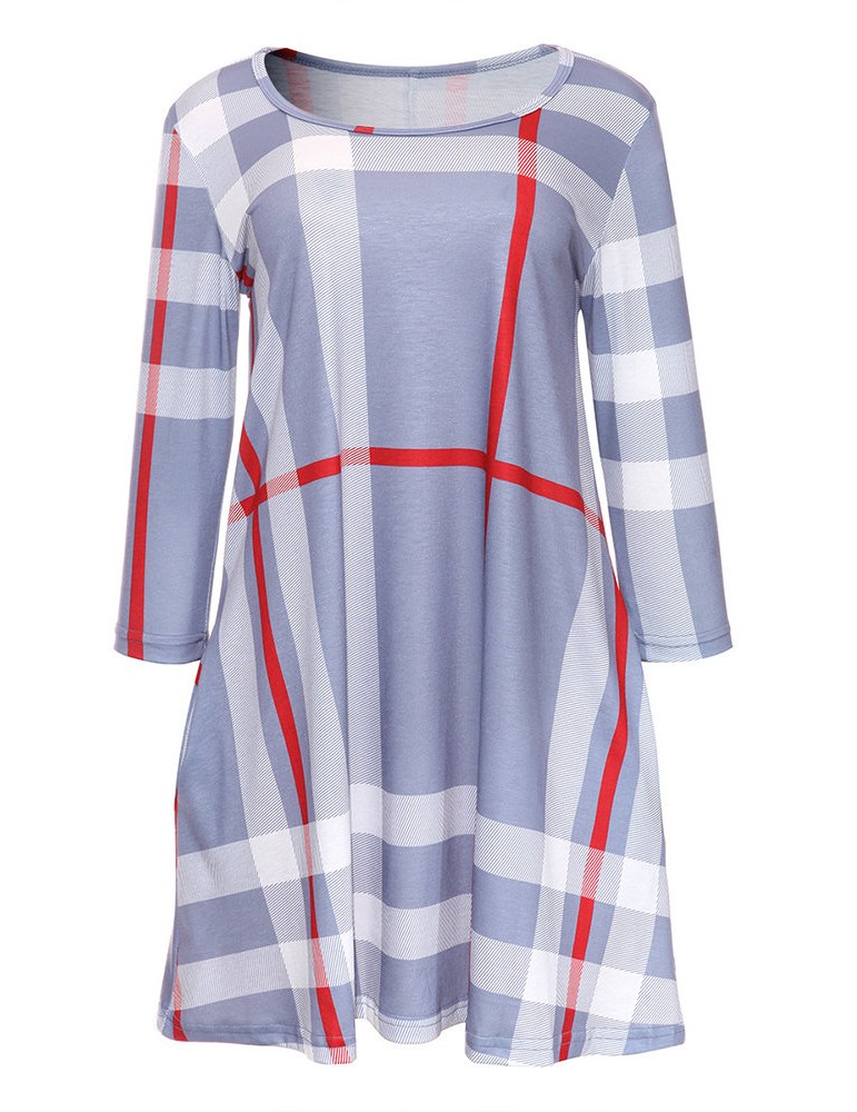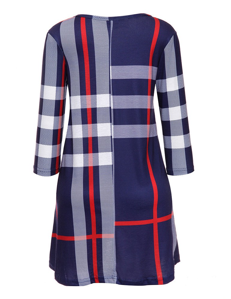 Plaid Women O-neck Long Sleeve Pockets Mini Dresses
