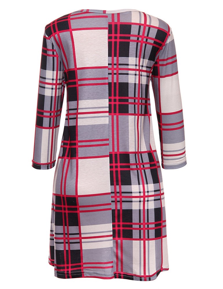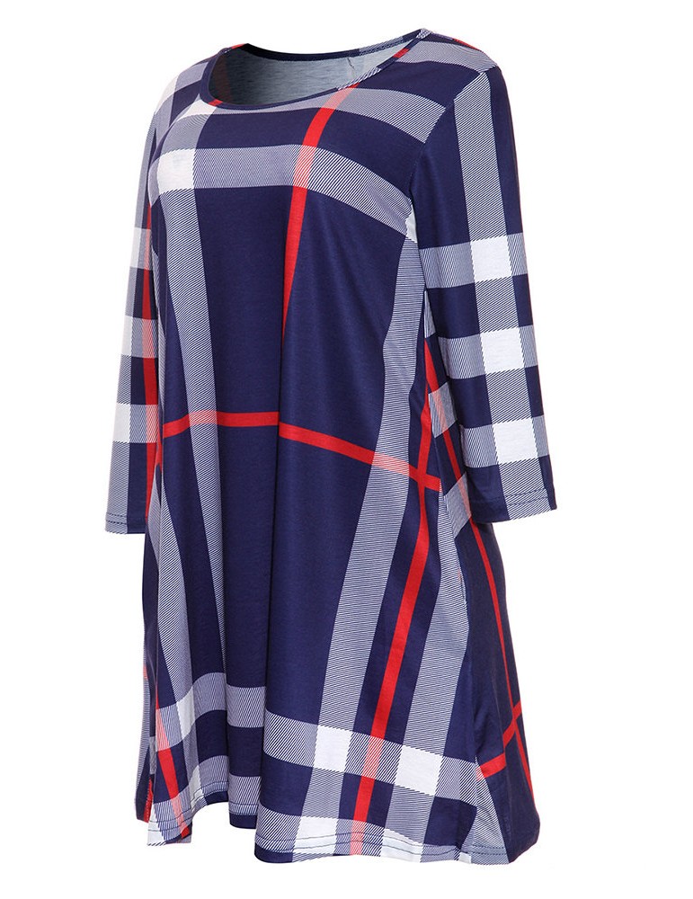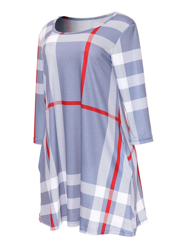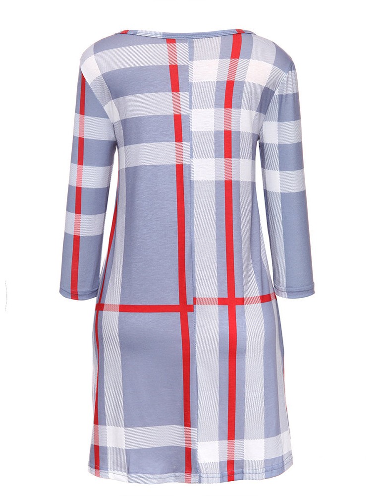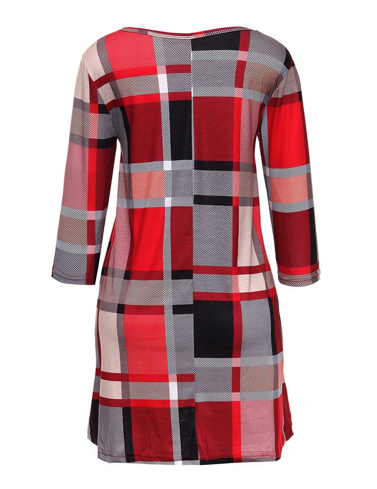 Plaid Women O-neck Long Sleeve Pockets Mini Dresses