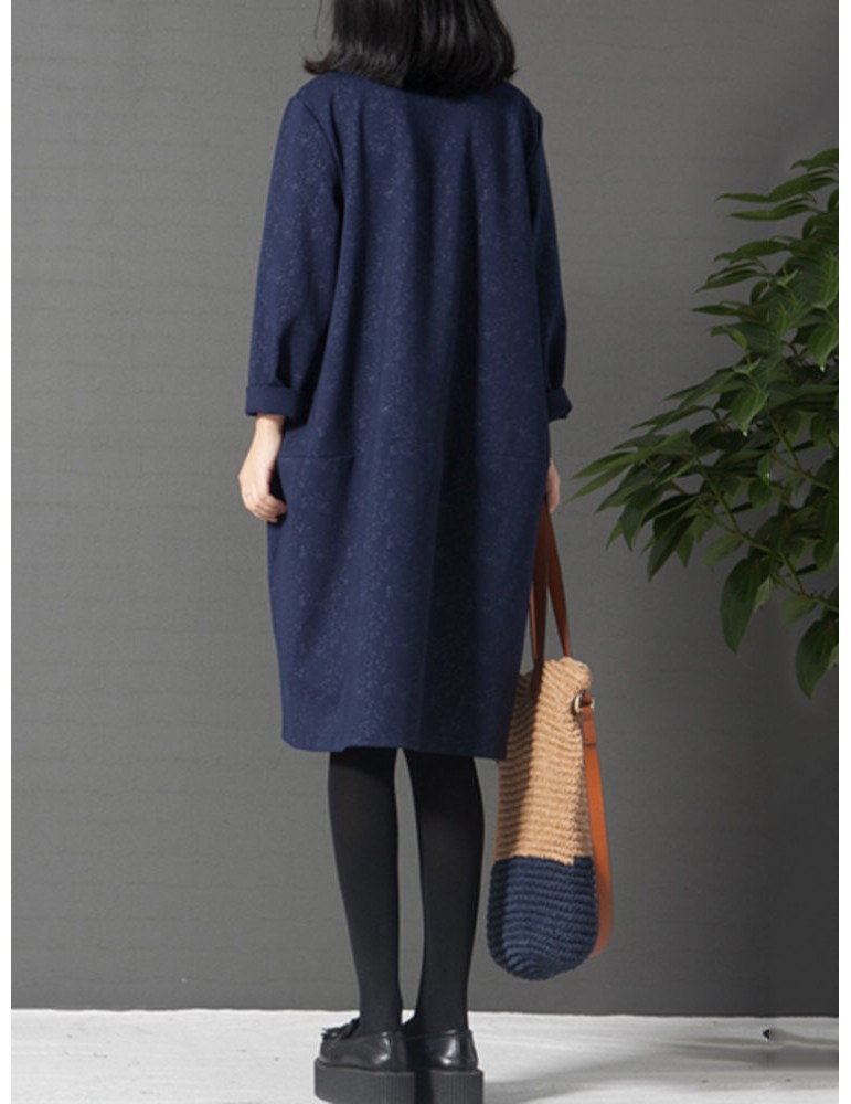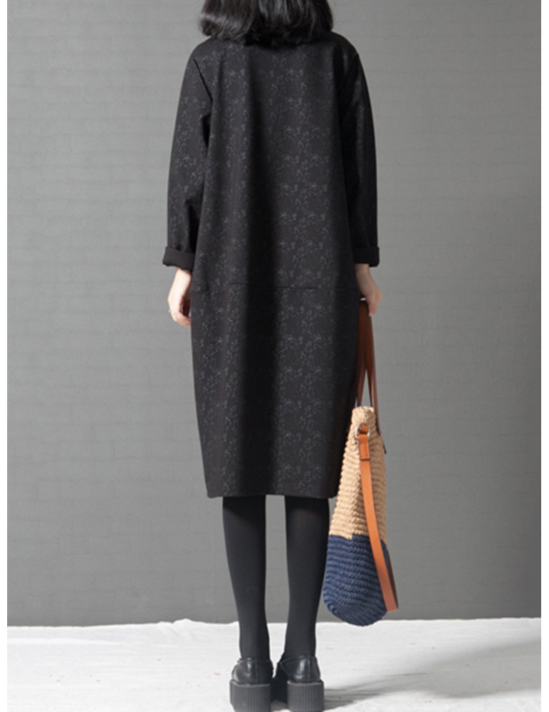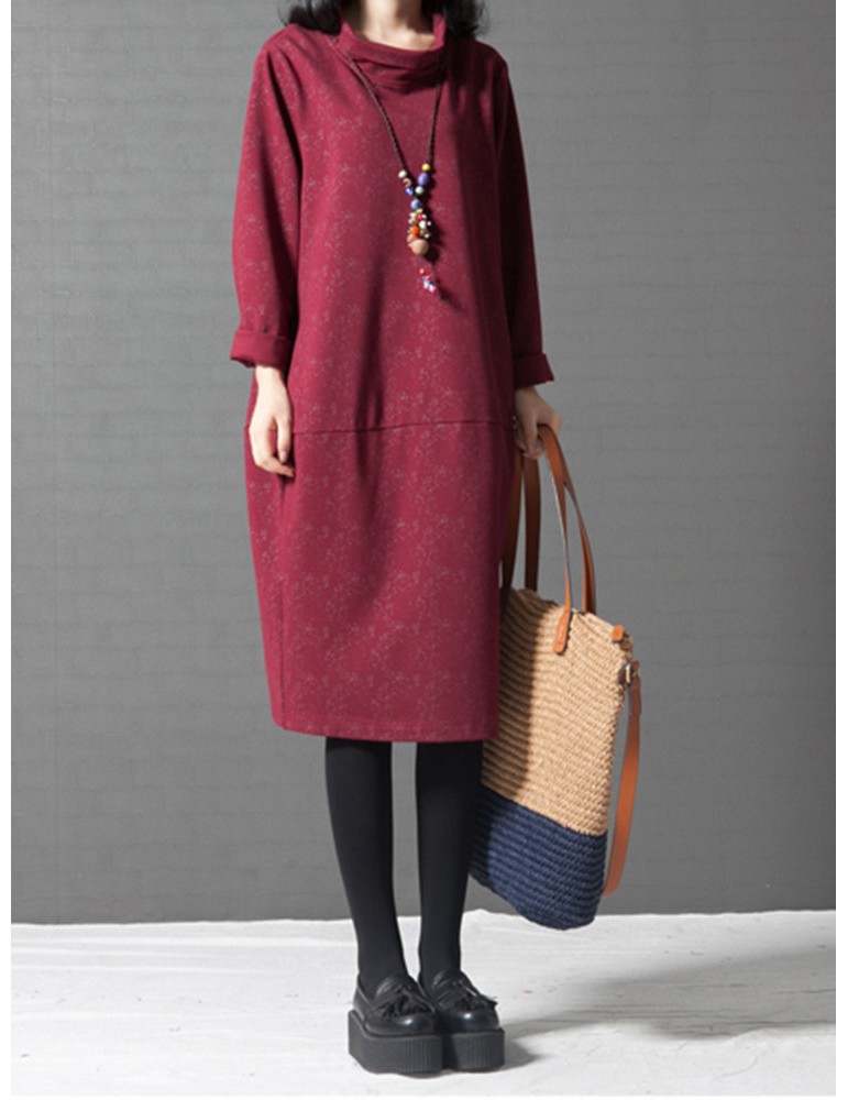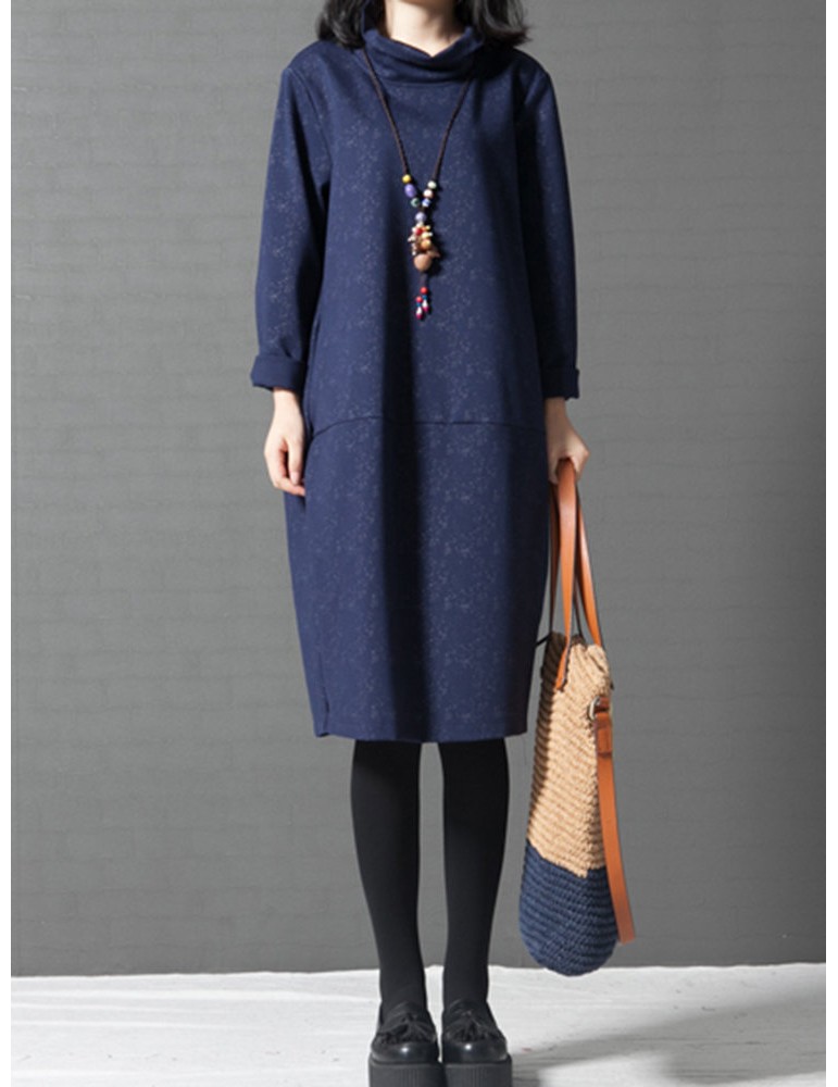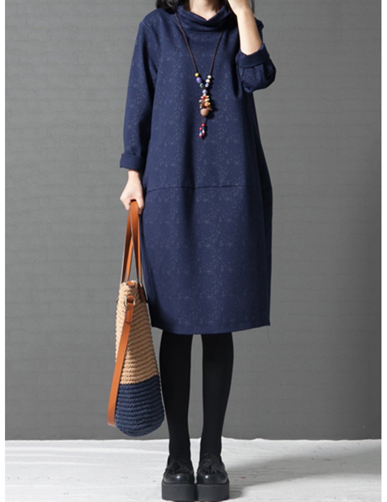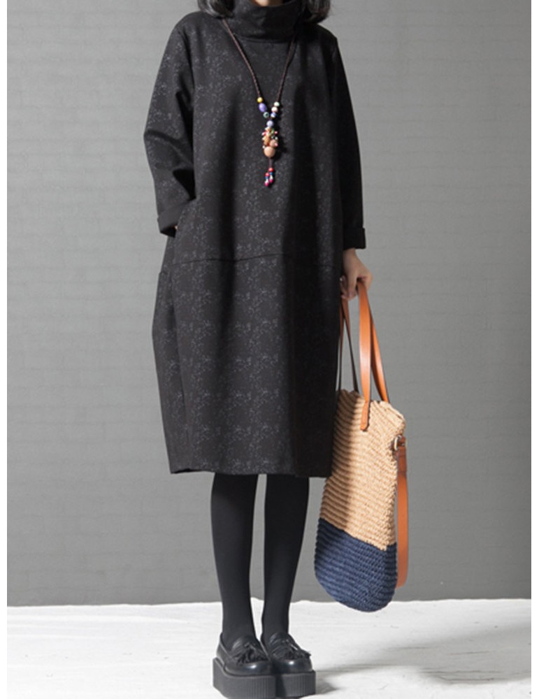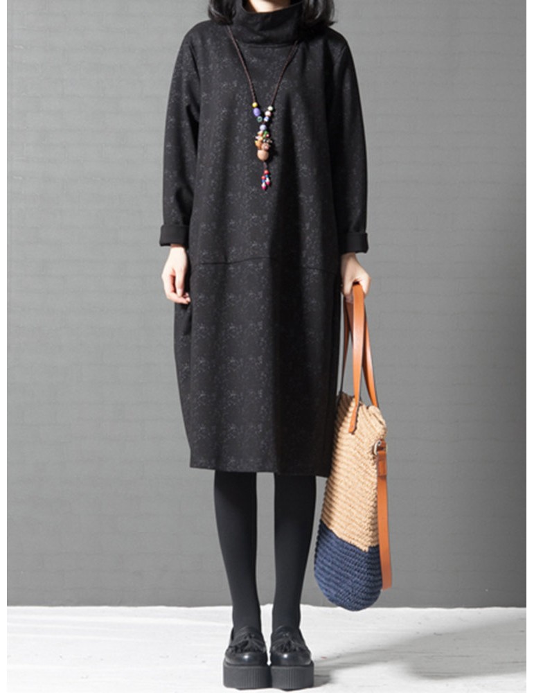 Women Printed Turtleneck Printed Pocket Long Sleeve Casual Dresses