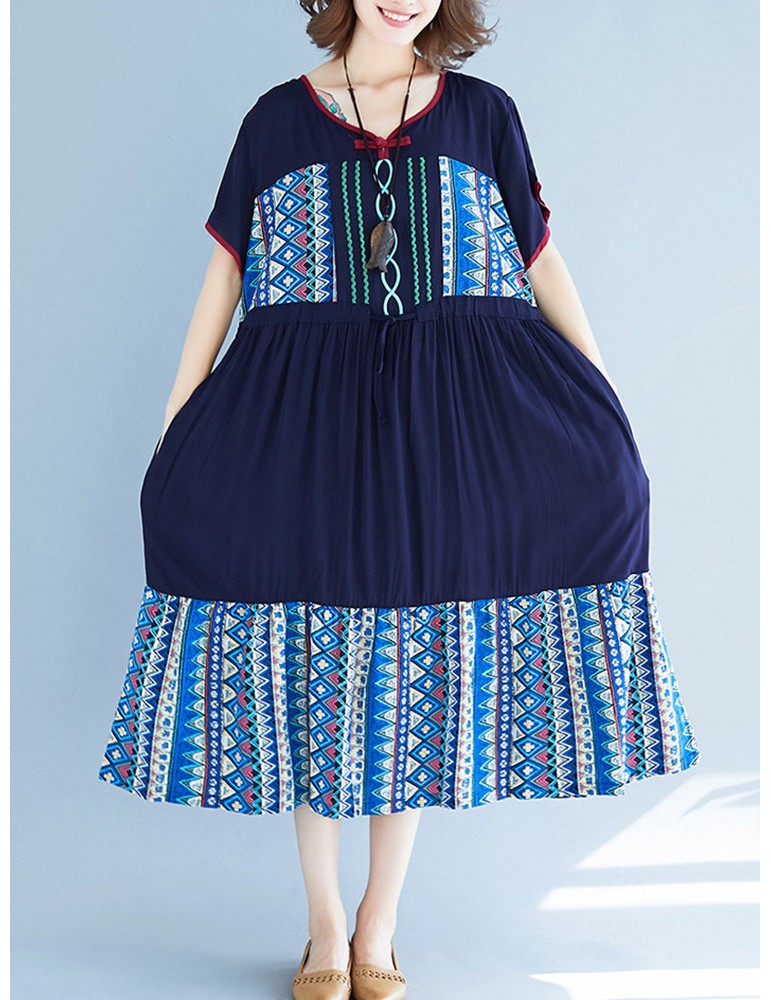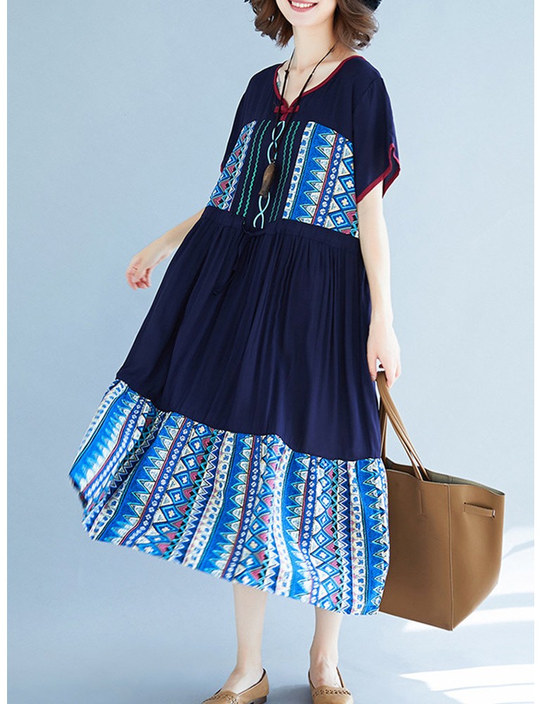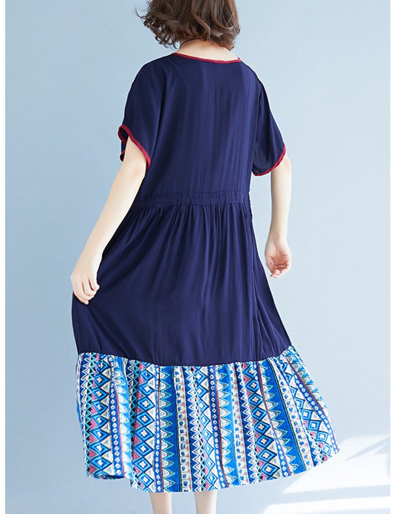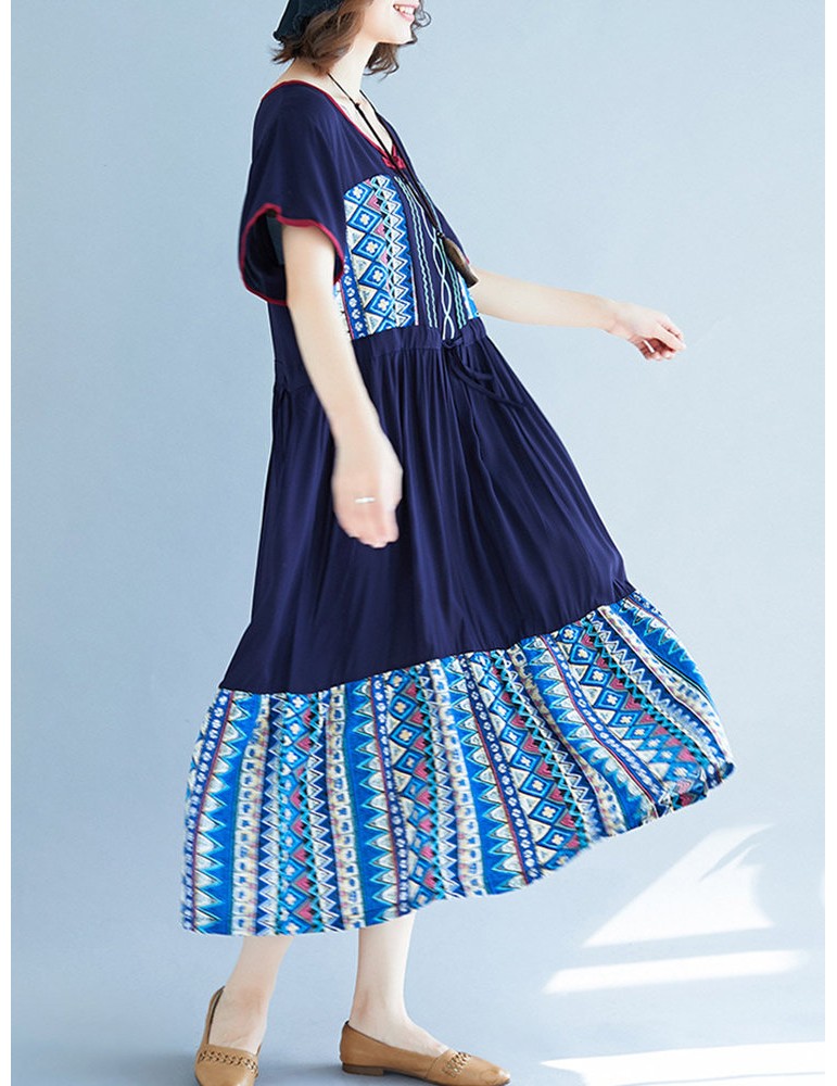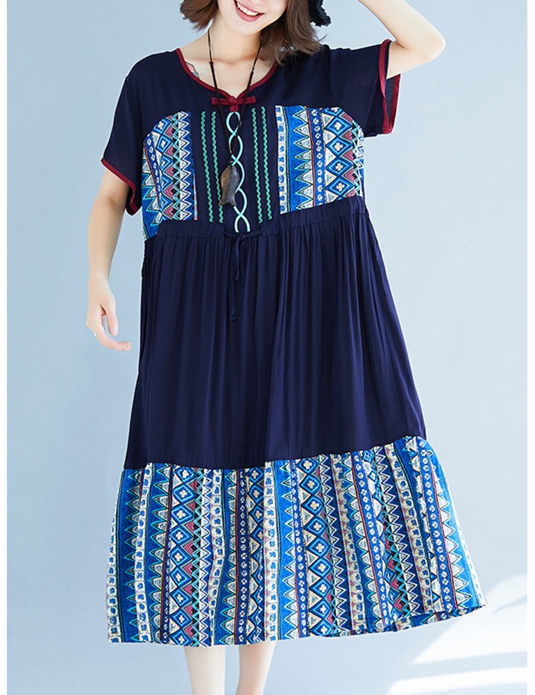 Vintage Ethnic Print Patchwork Short Sleeve Dress