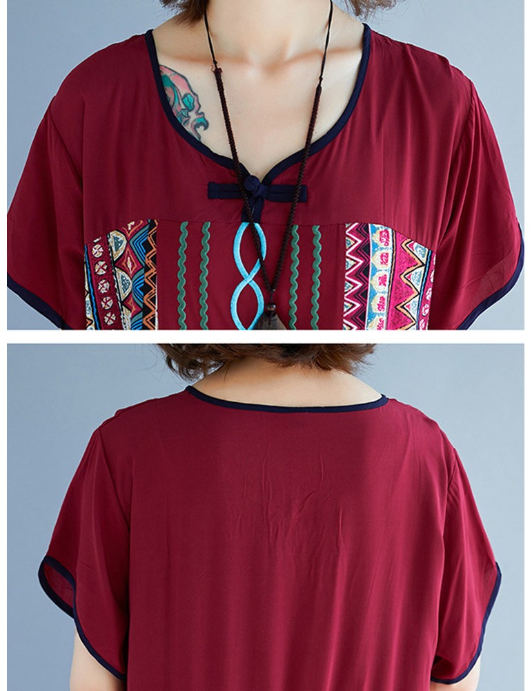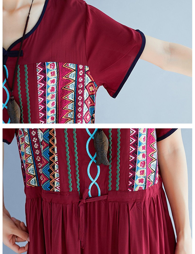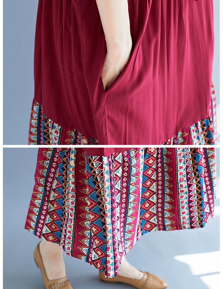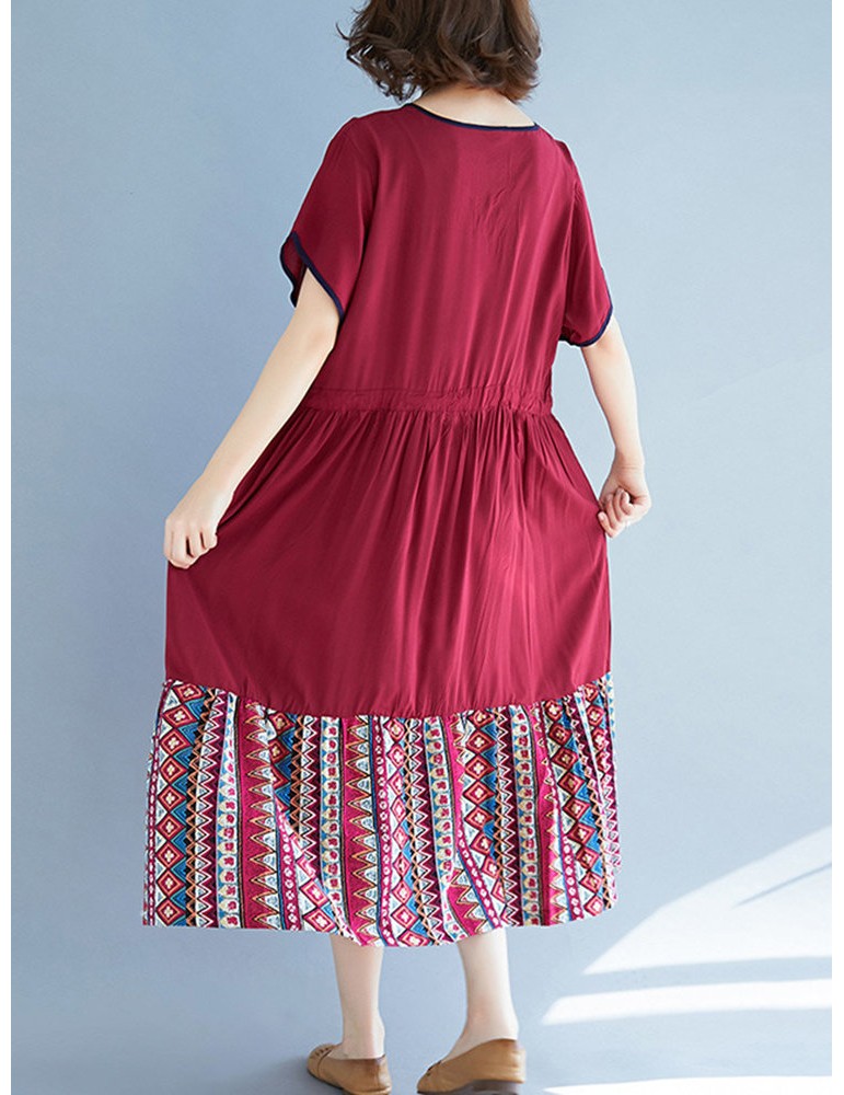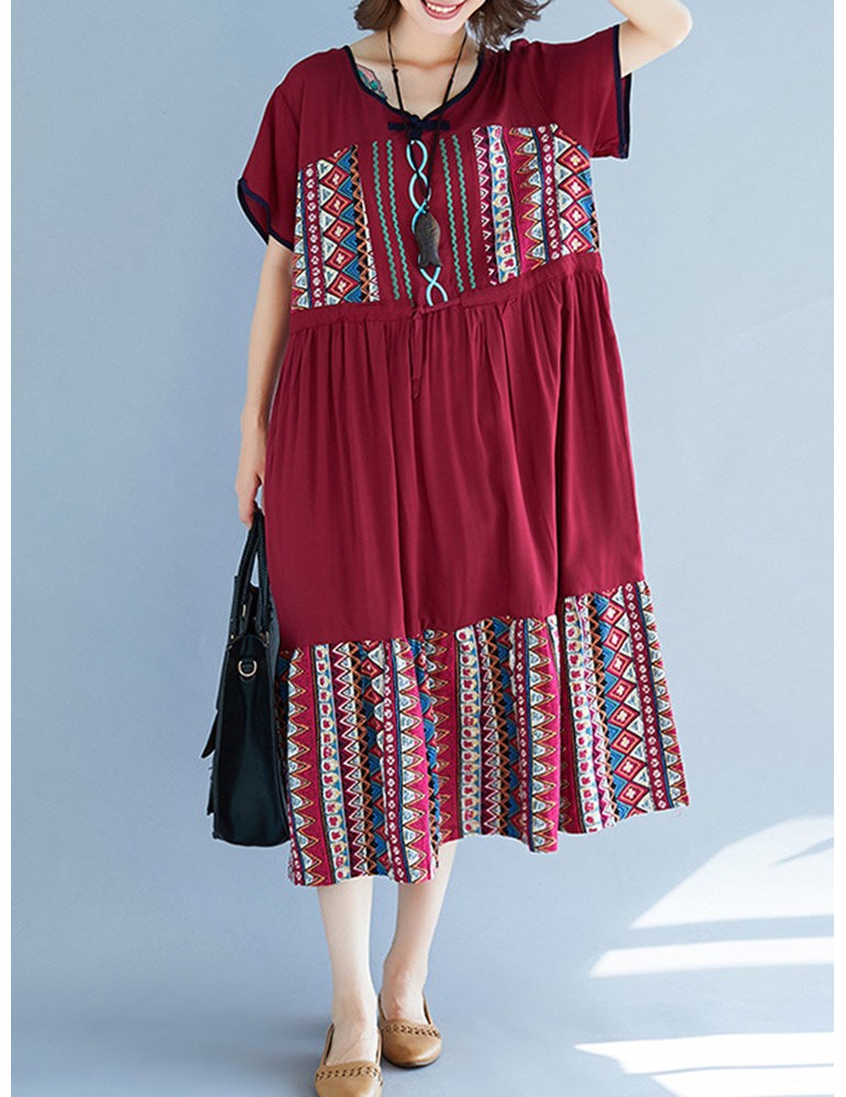 Vintage Ethnic Print Patchwork Short Sleeve Dress