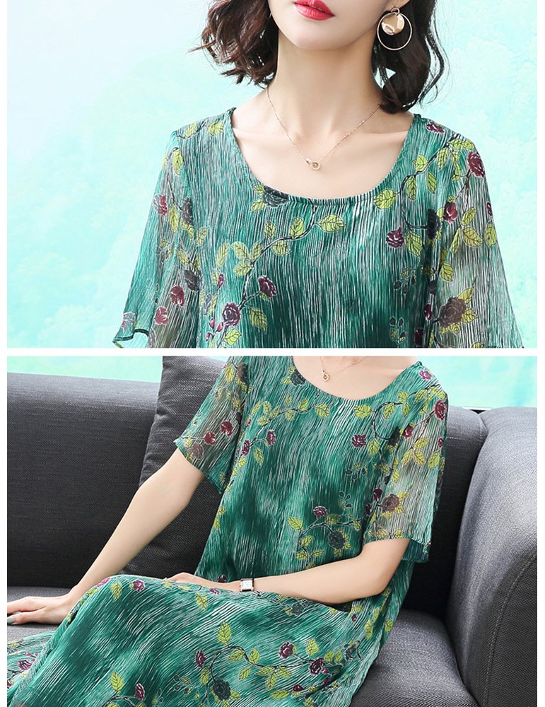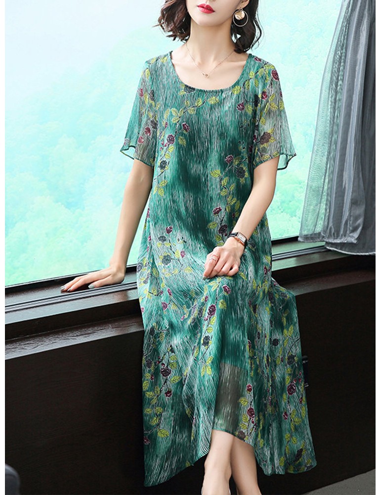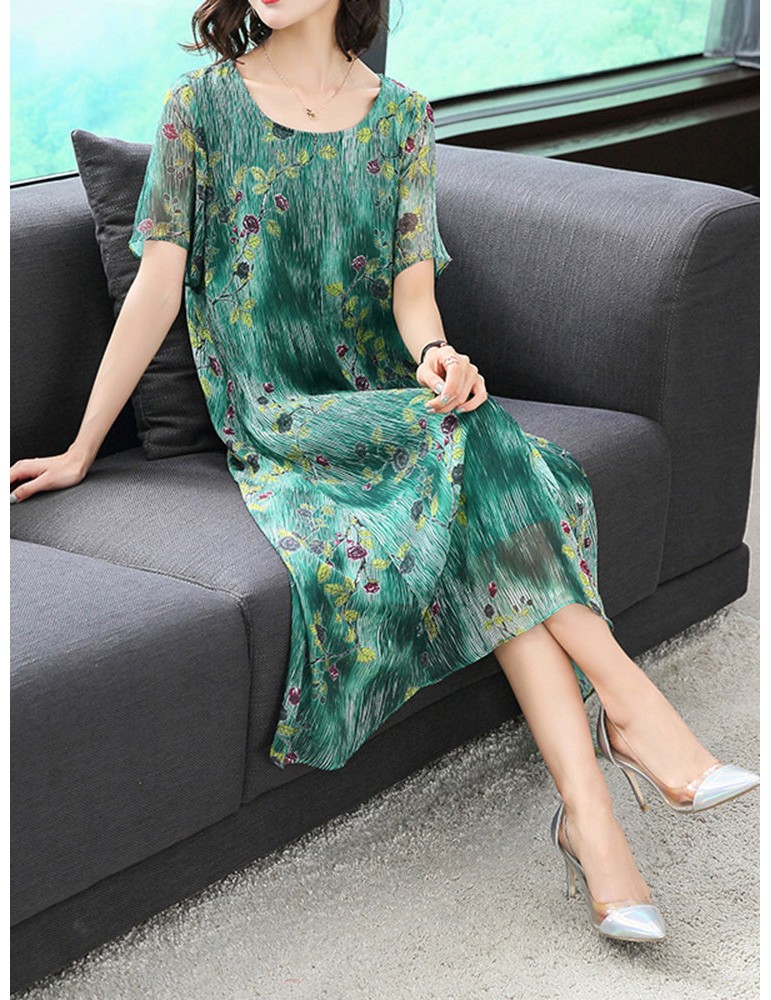 Elegant Floral Print Gradient Short Sleeve Mid-long Dresses