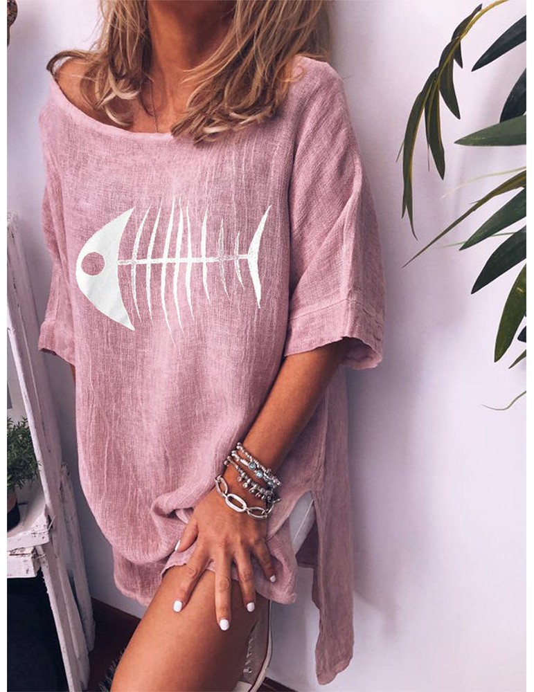 Fish-bone Print Crew Neck Short Sleeve Casual Dress