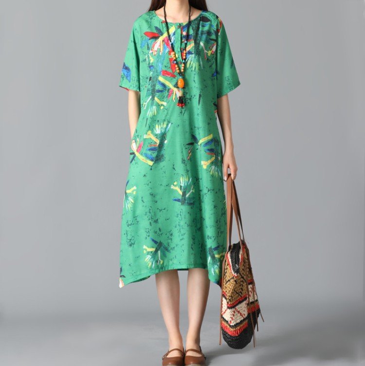 Graffiti Leaves Print Short Sleeve Irregular Vintage Dresses