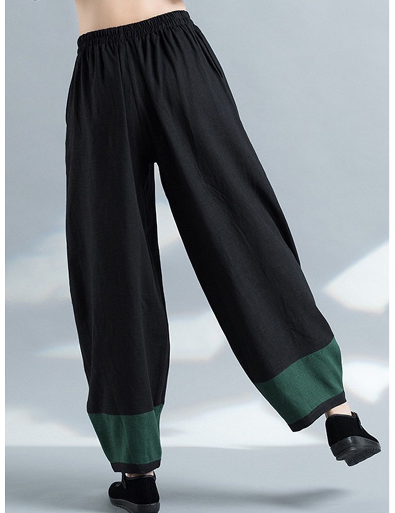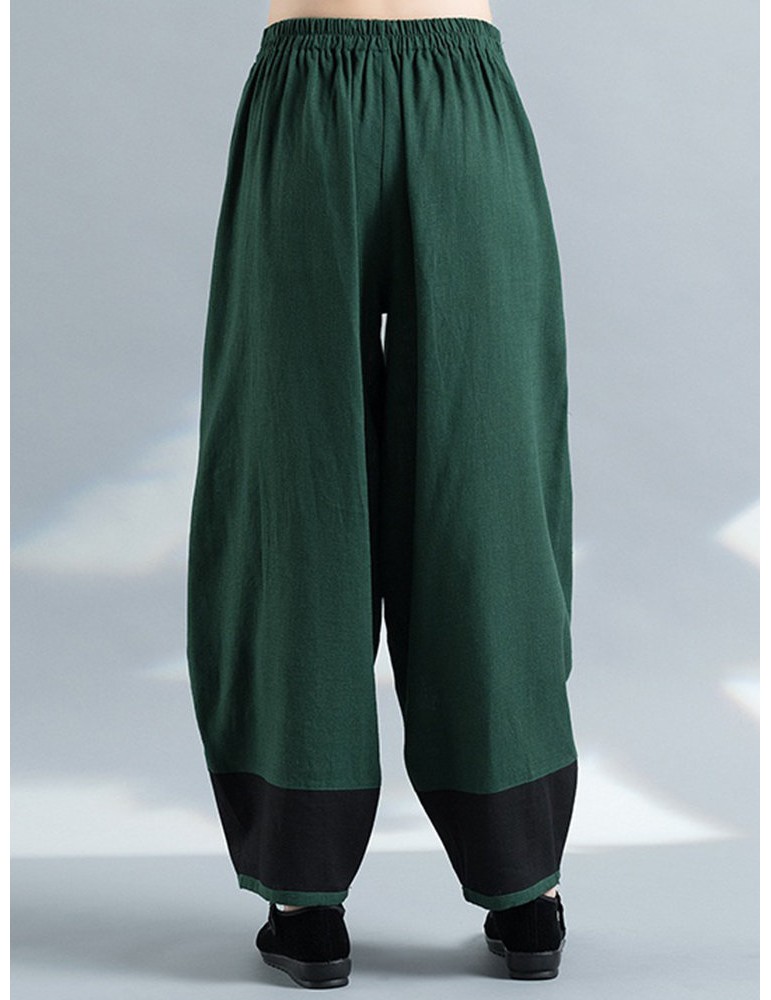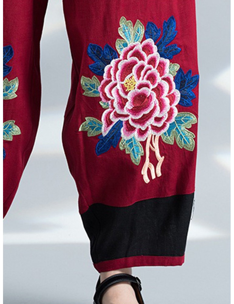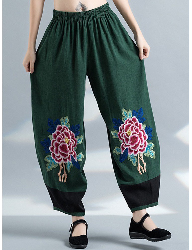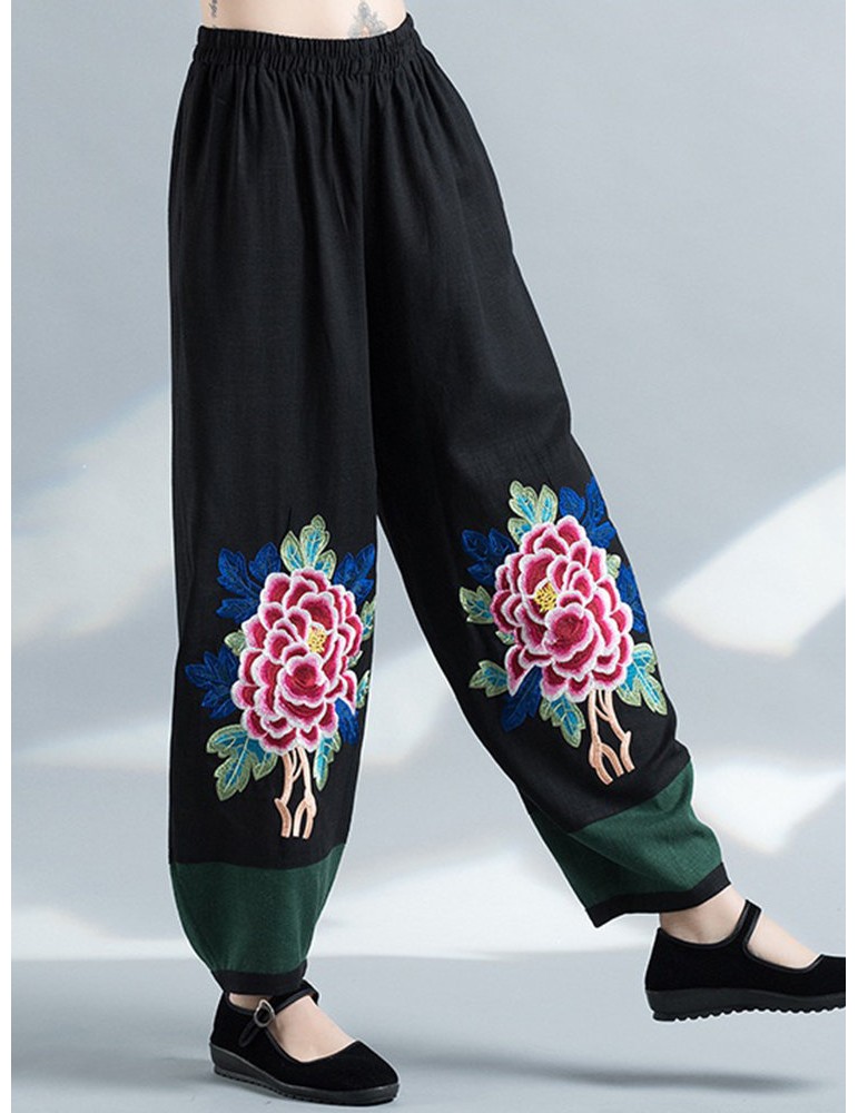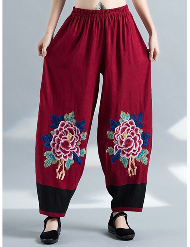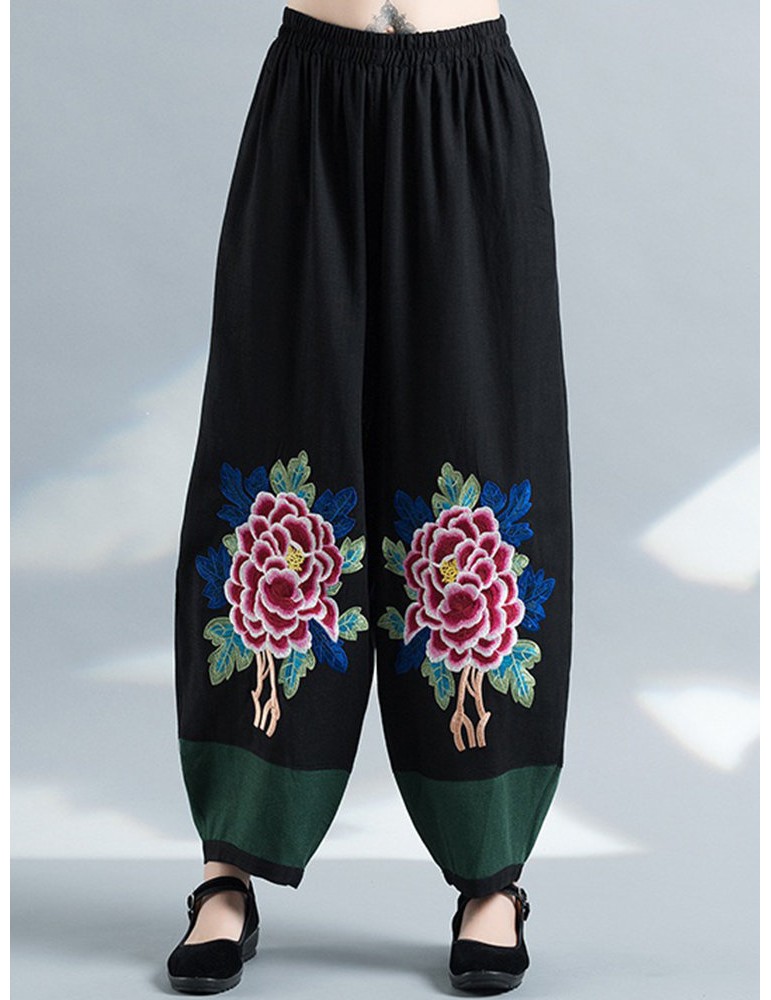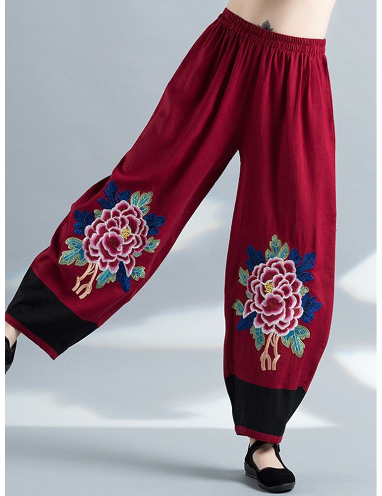 Vintage Embroidery Elastic Waist Women Wide Leg Pants