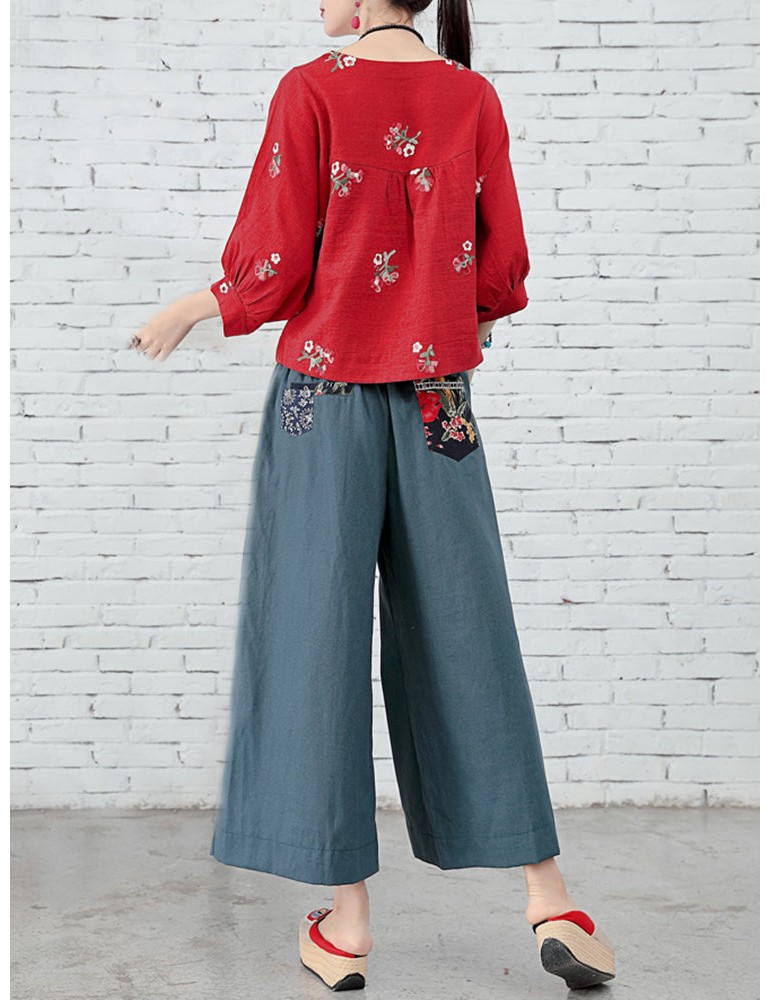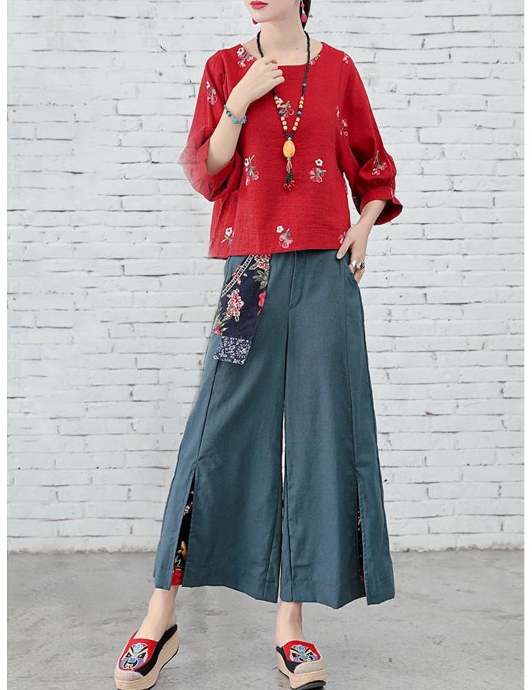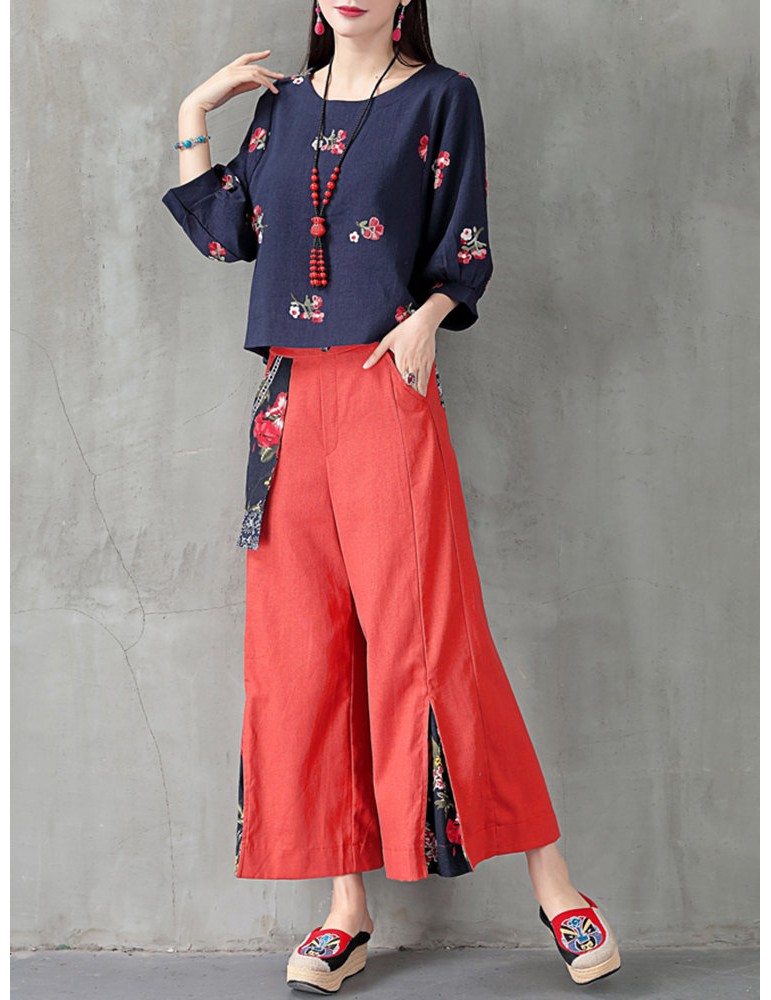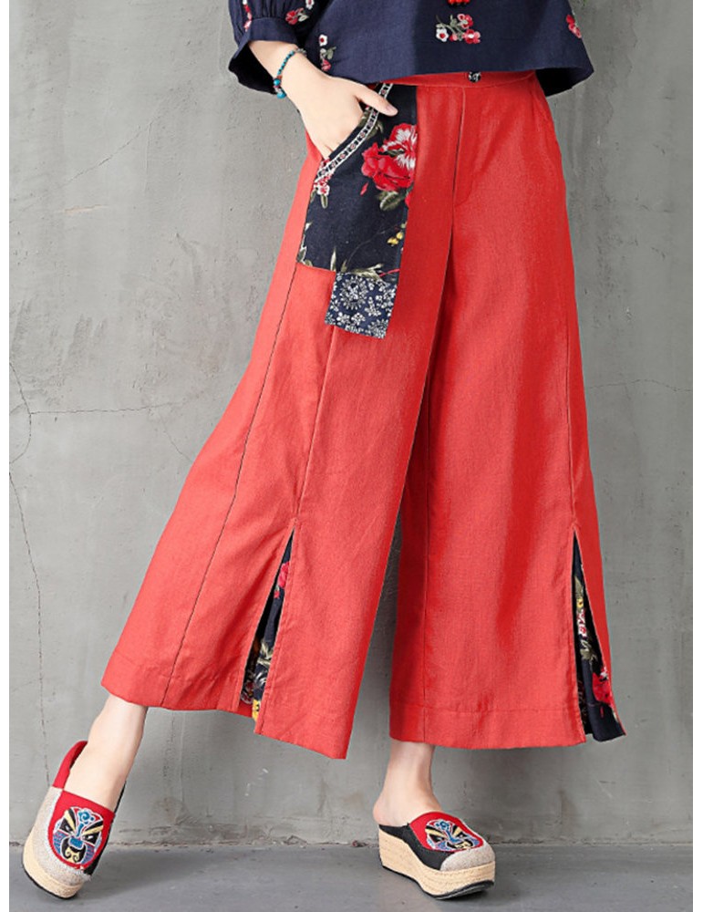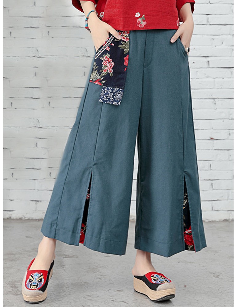Folk Style Floral Print Patchwork Splited High Waist Women Pants