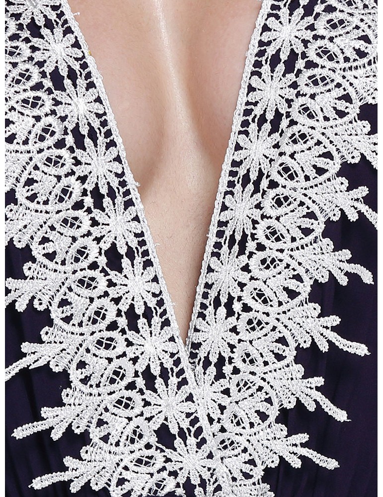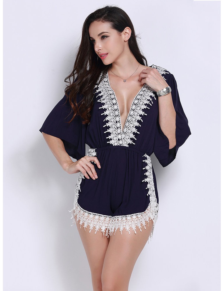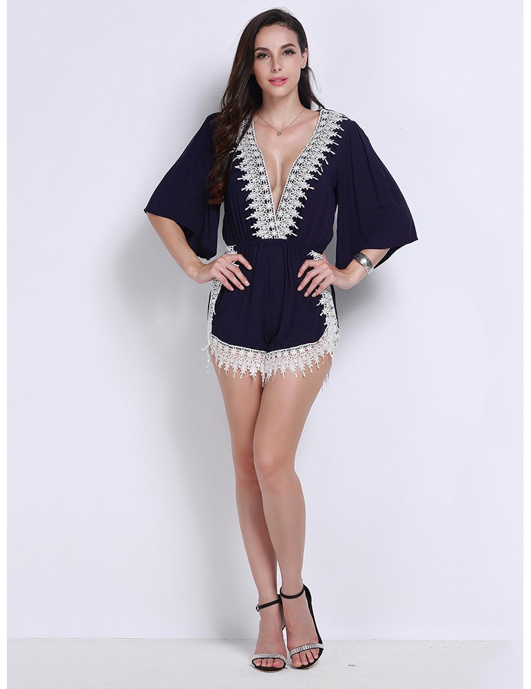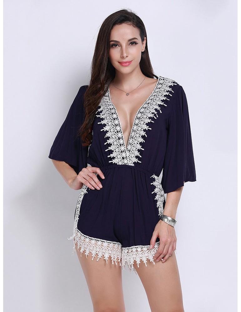 Women Deep V-neck Half Sleeves Lace Jumpsuit