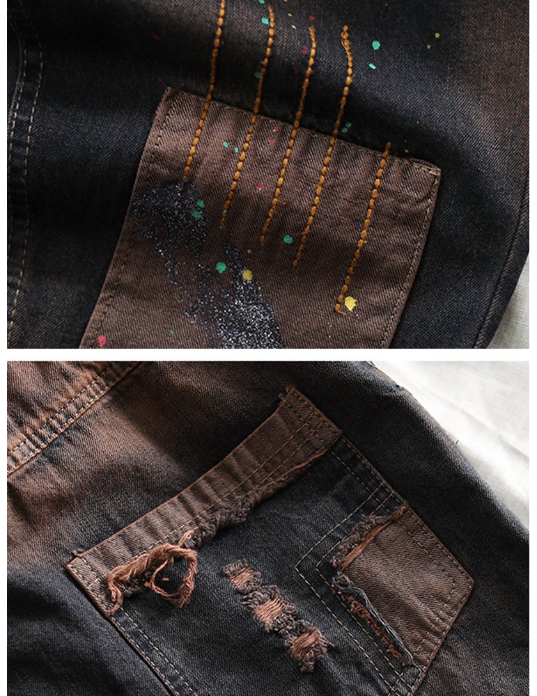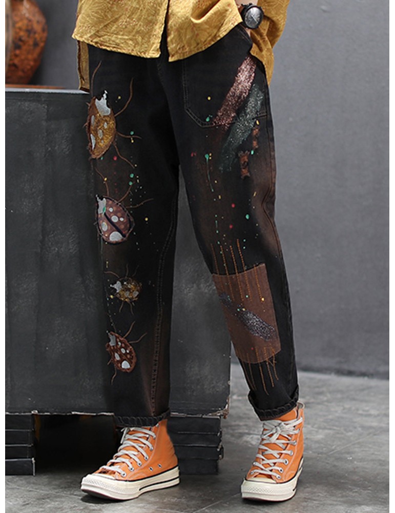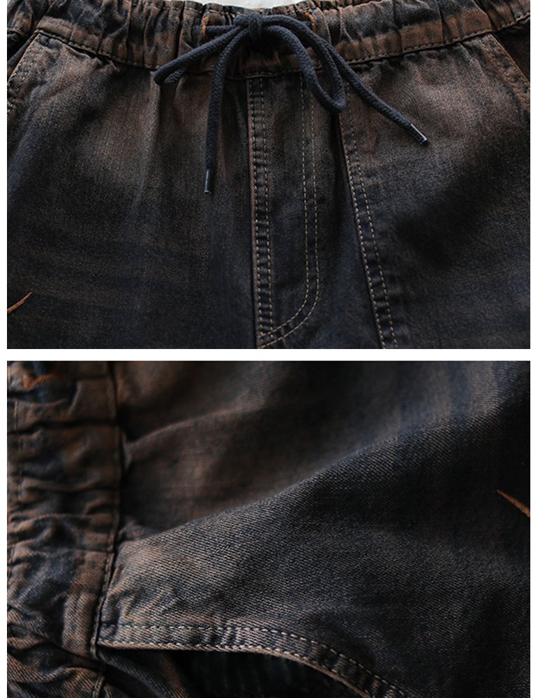 Patch Embroidered Drawstring Waist Ripped Jeans For Women