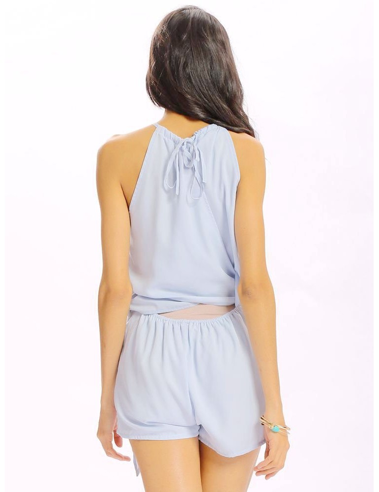 Women Casual Bow Knot Bandage O-neck Sleeveless Solid Color Short Jumpsuit