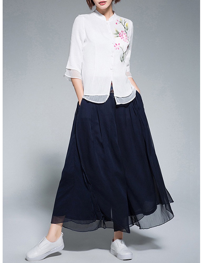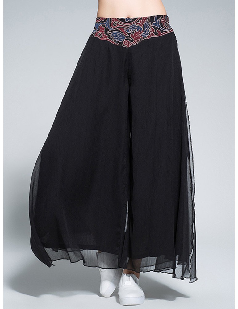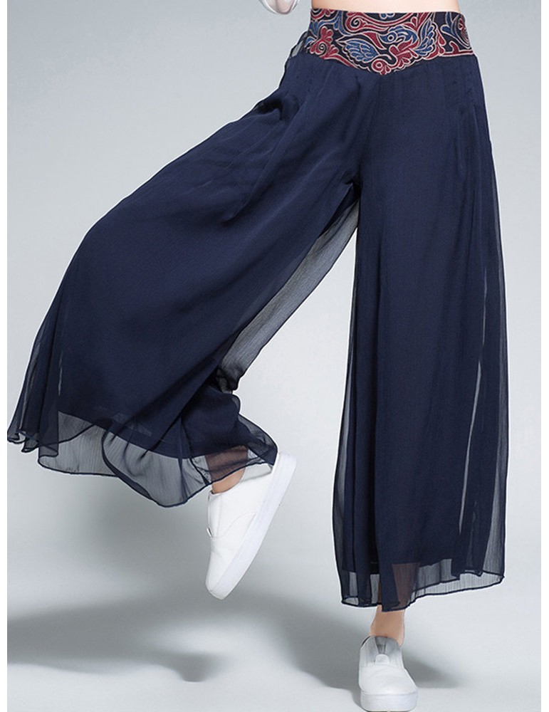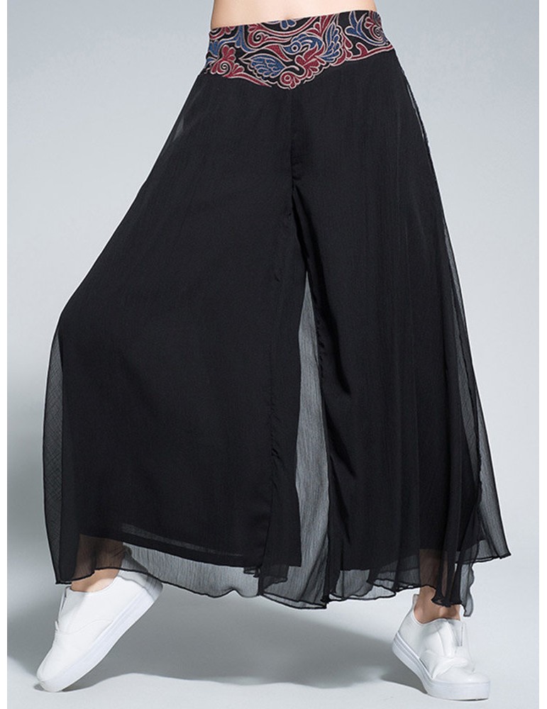 Ethnic Embroidery Patchwork Layered Wide Leg Women Pants