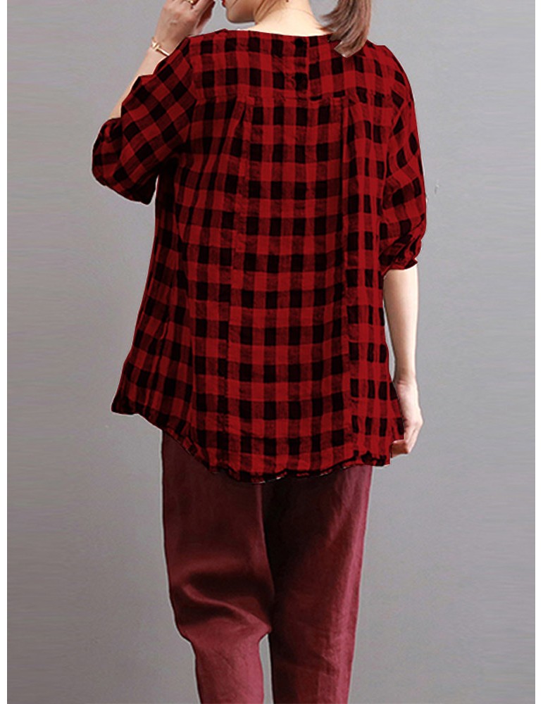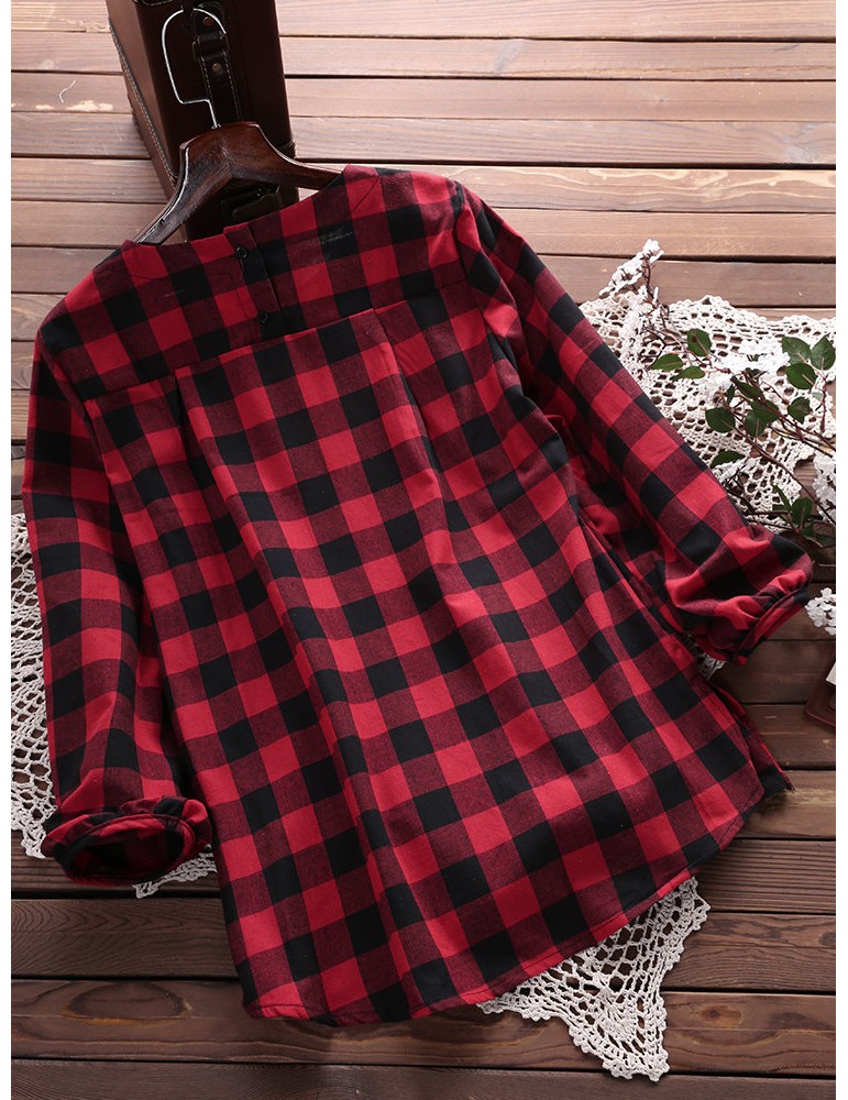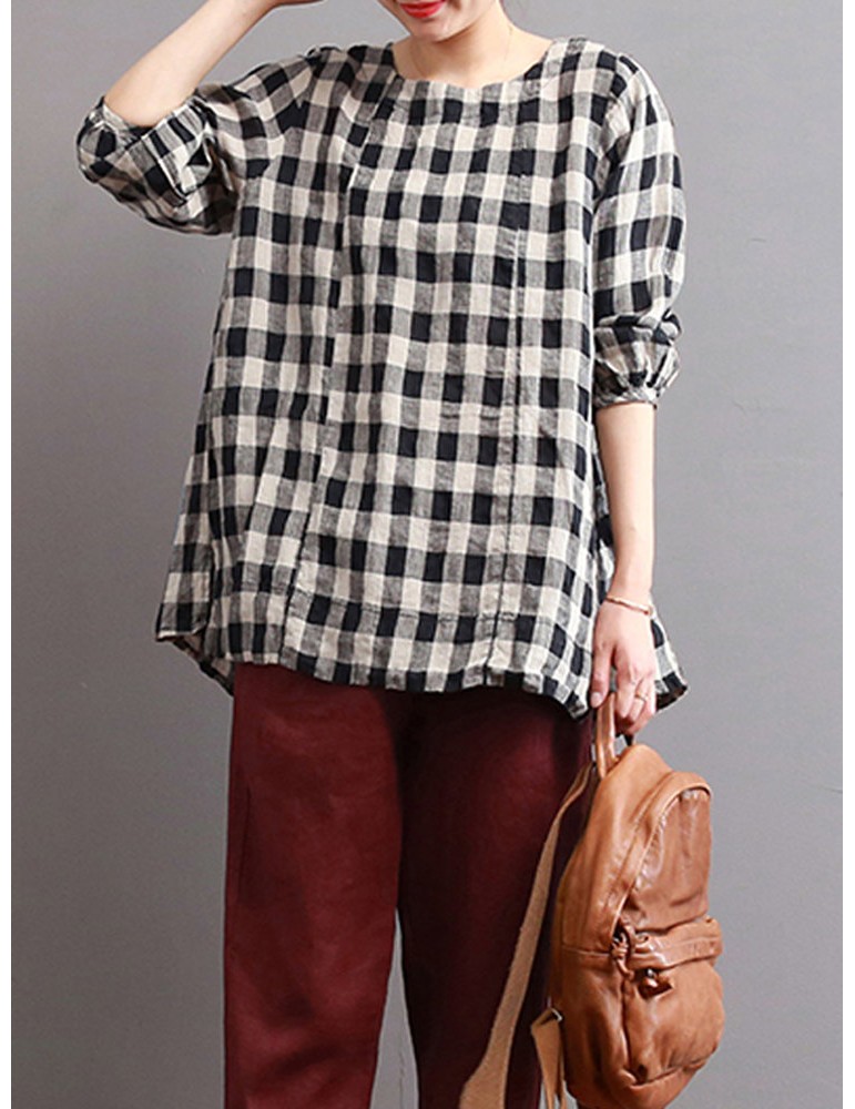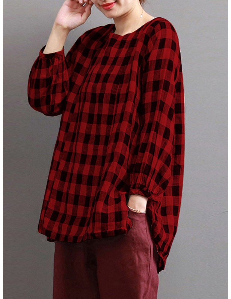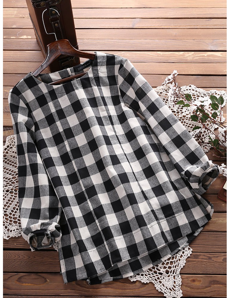 Women Check Plaid Long Sleeve Irregular Hem Loose Blouses