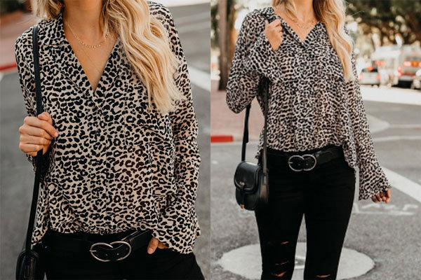 Leopard Trumpet Long Sleeve V-neck Loose Women Blouse