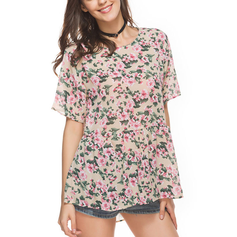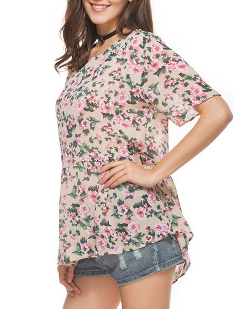 Casual Floral Print Pleated Short Sleeve O-neck Women T-shirt