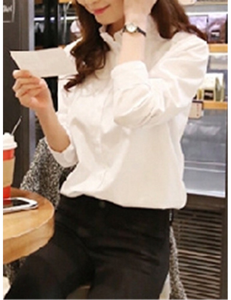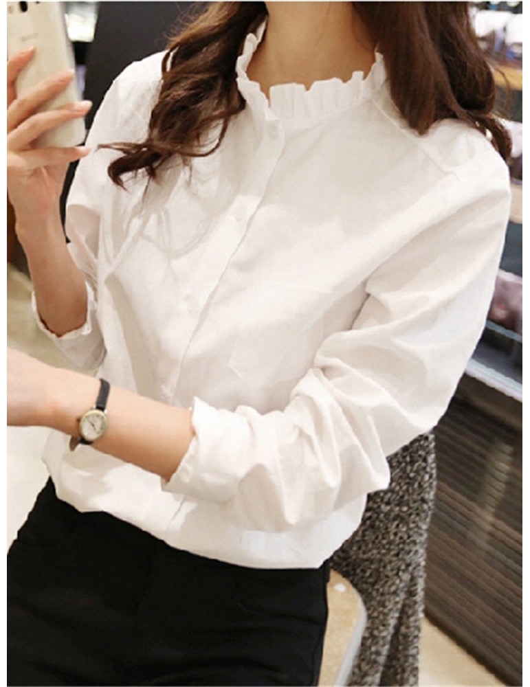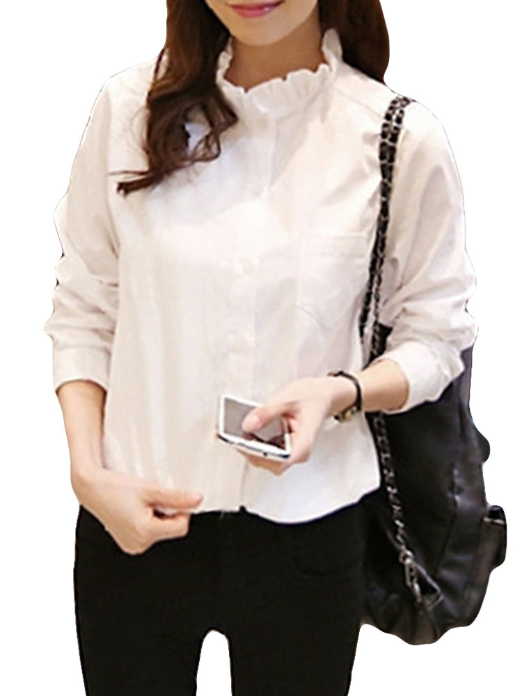 Ruffles Neck Solid Color Long Sleeve Shirt