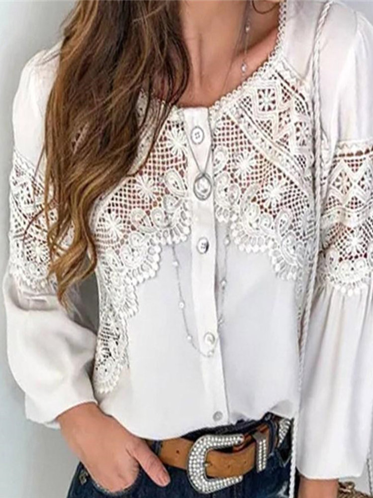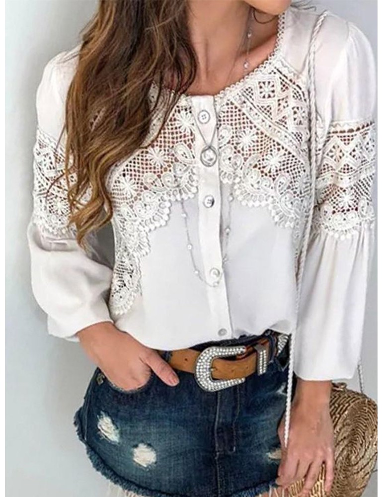Elegant Lace Stitching Patchwork Puff Sleeve Women Blouse