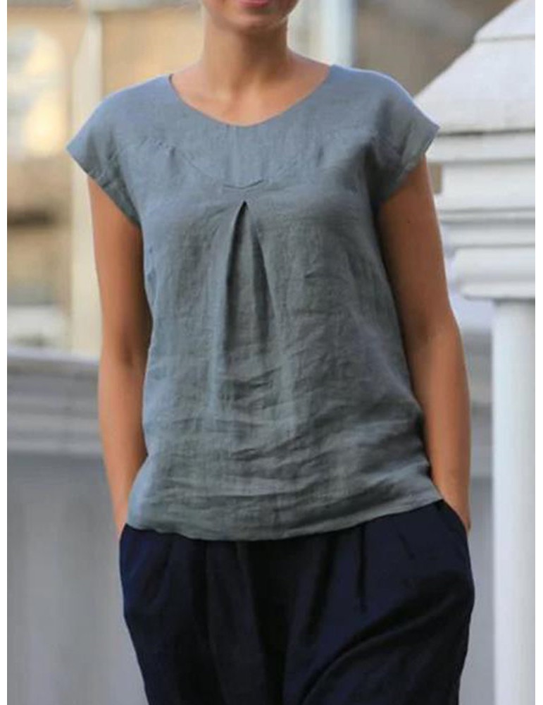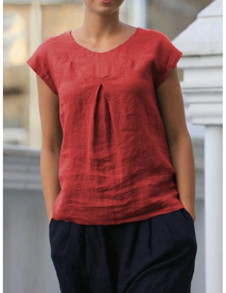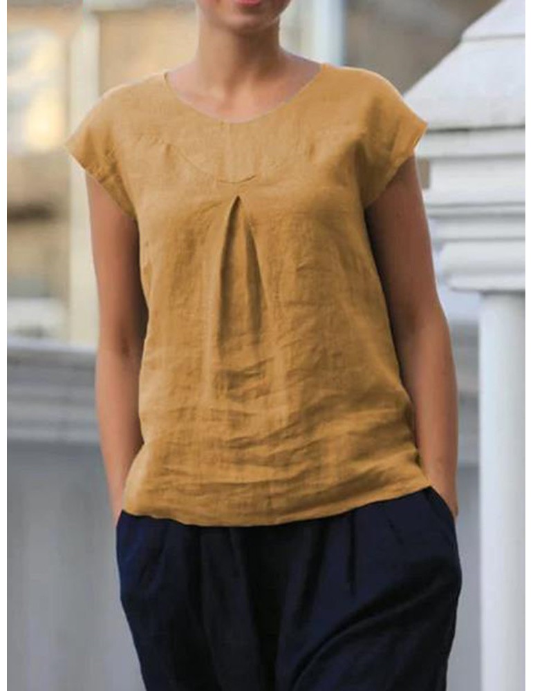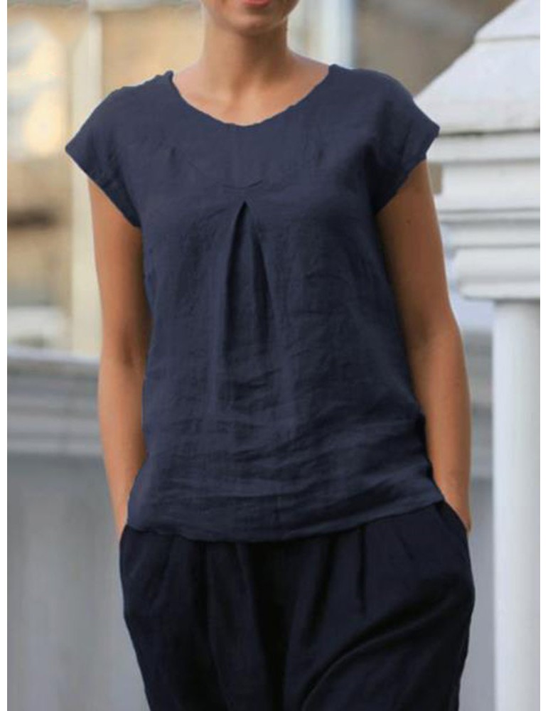 Short Sleeve Pleated Solid Color Casual T-shirt For Women