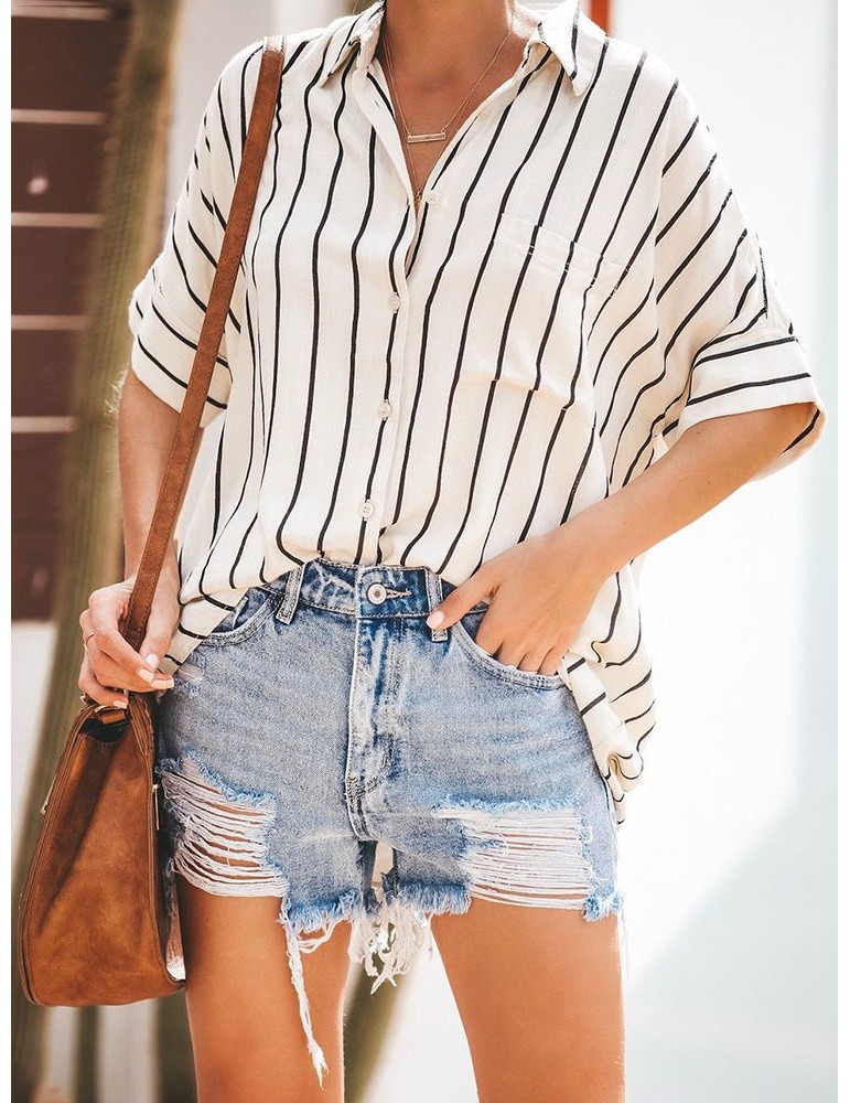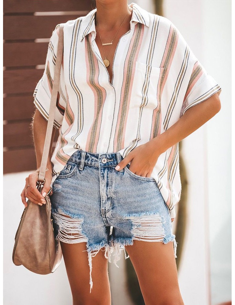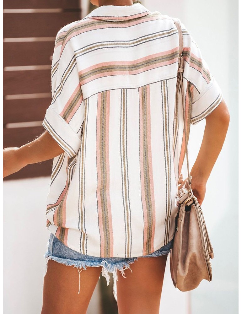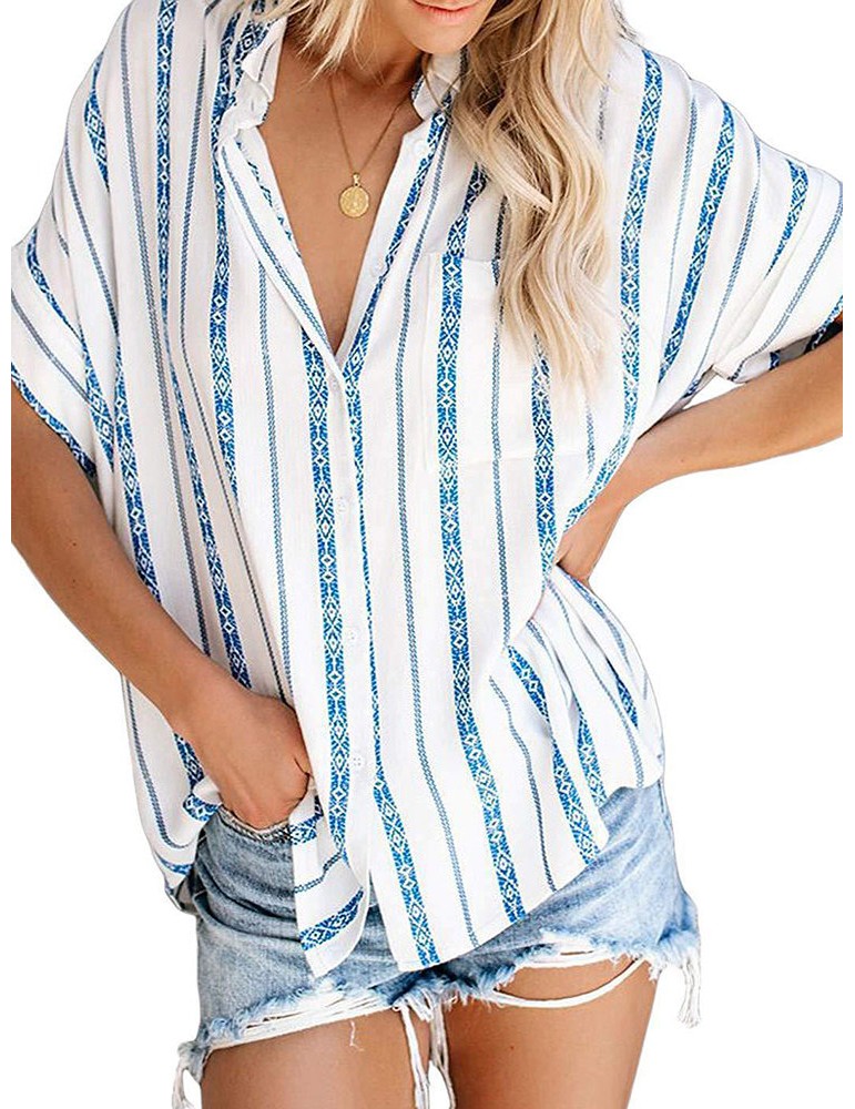 Bohemian Striped Print Button Short Sleeve Casual Blouse