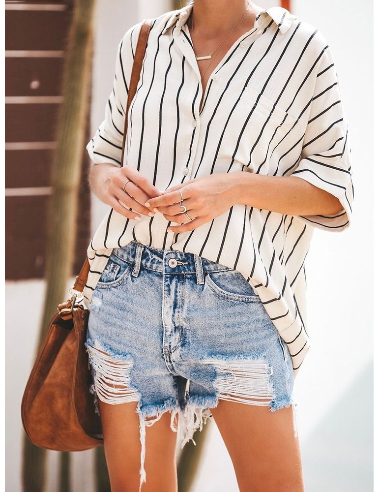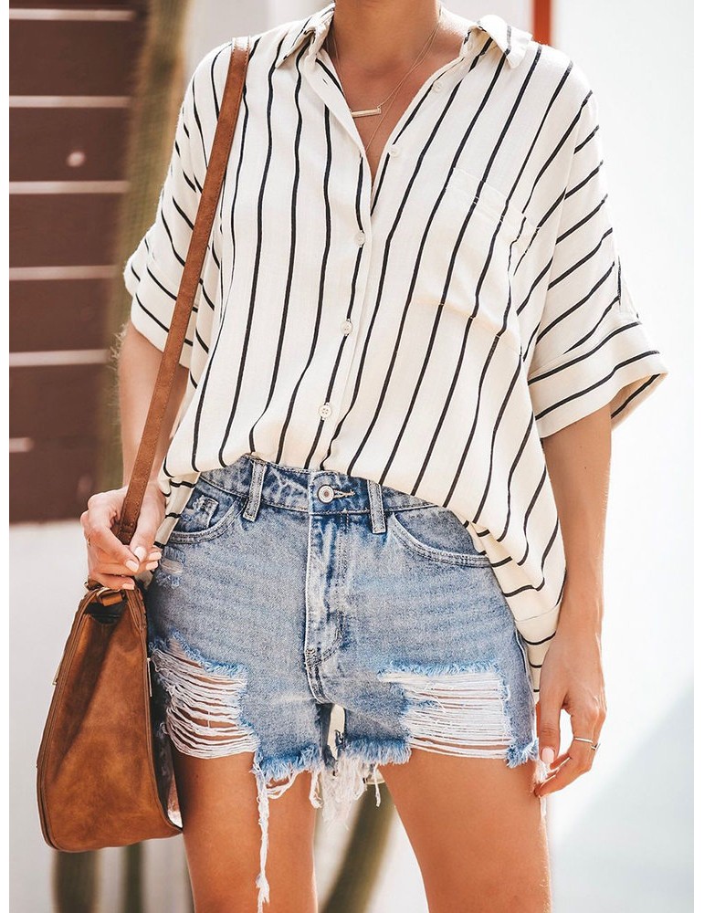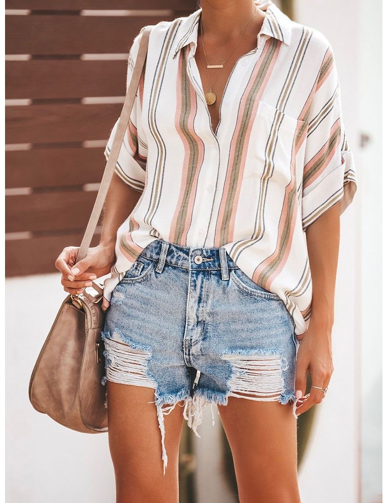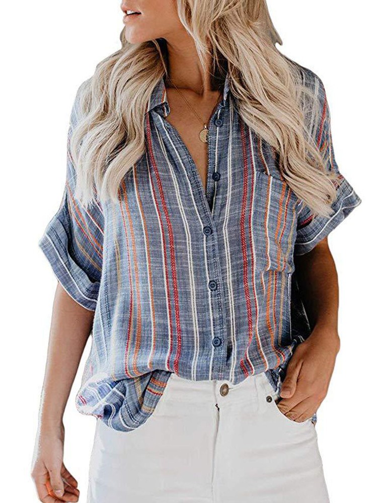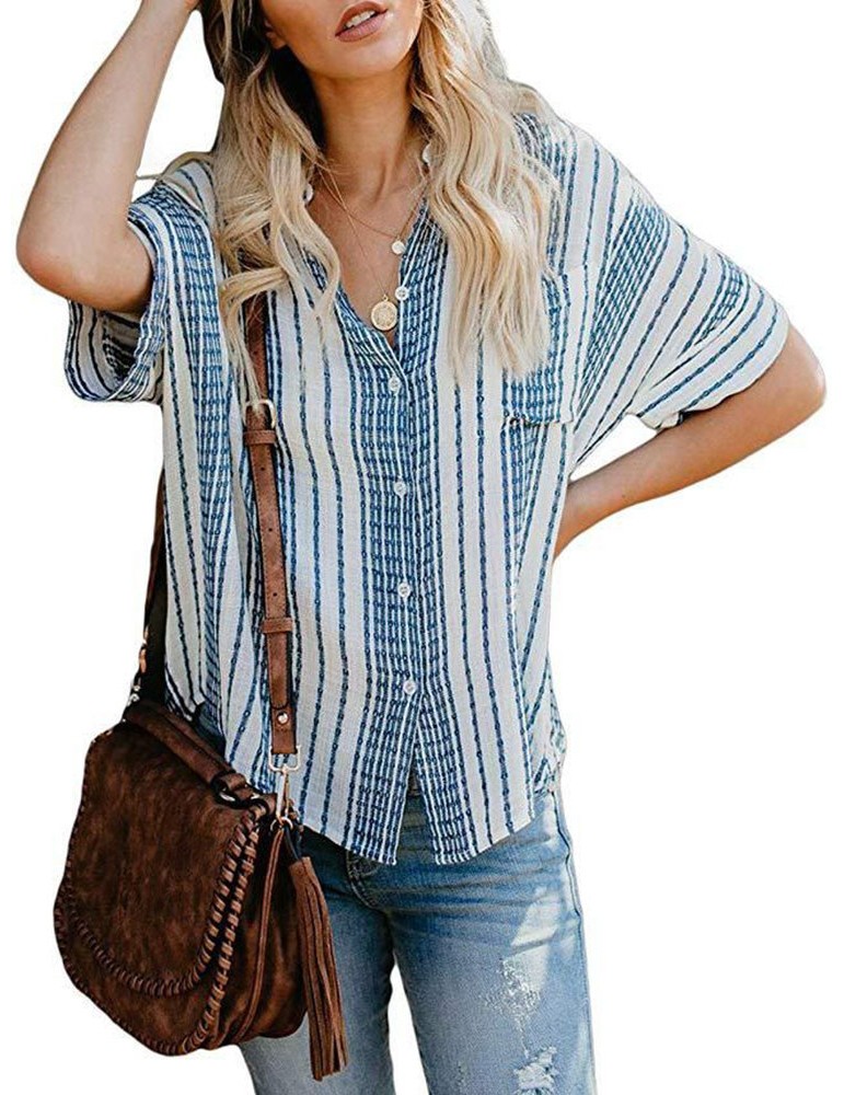 Bohemian Striped Print Button Short Sleeve Casual Blouse