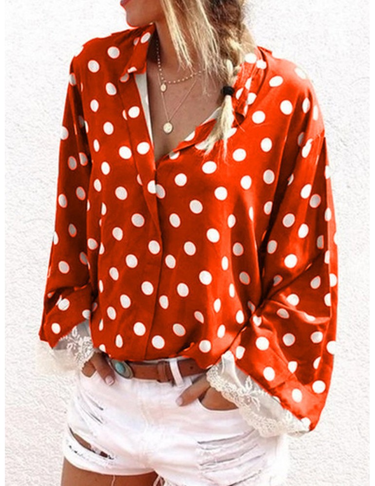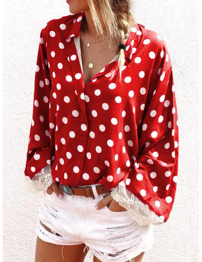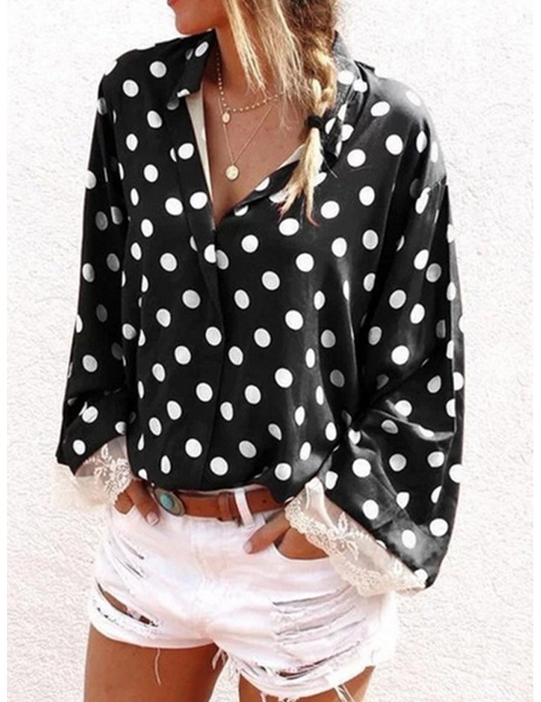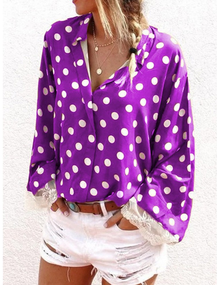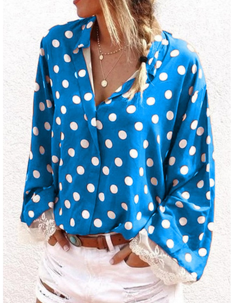Lace Patchwork Polka Dot Long Sleeve Blouse For Women