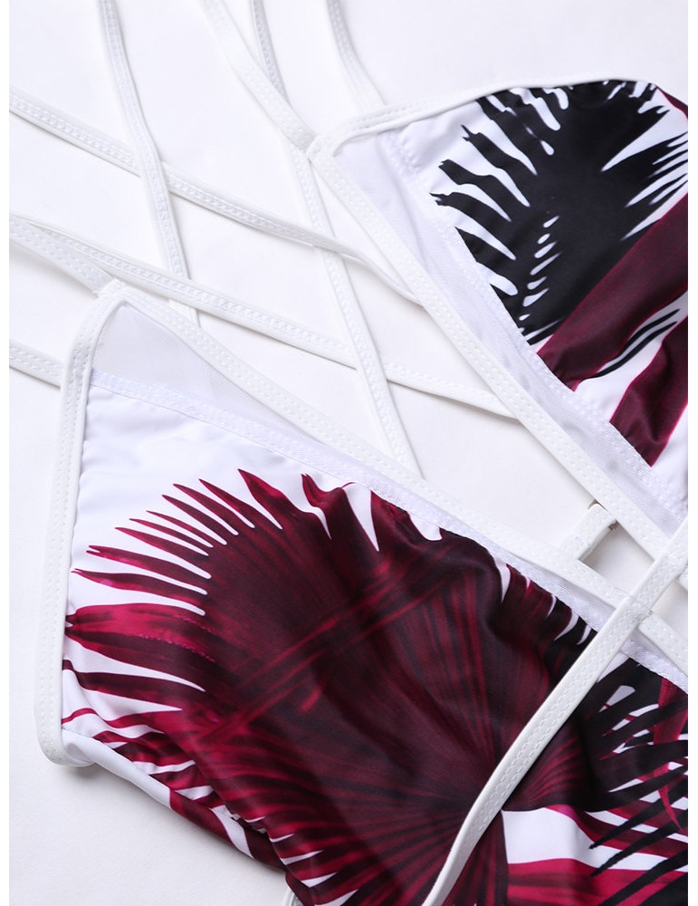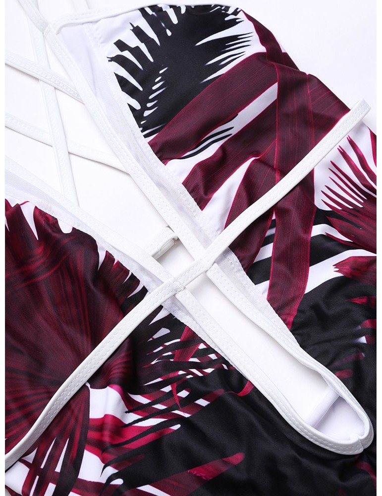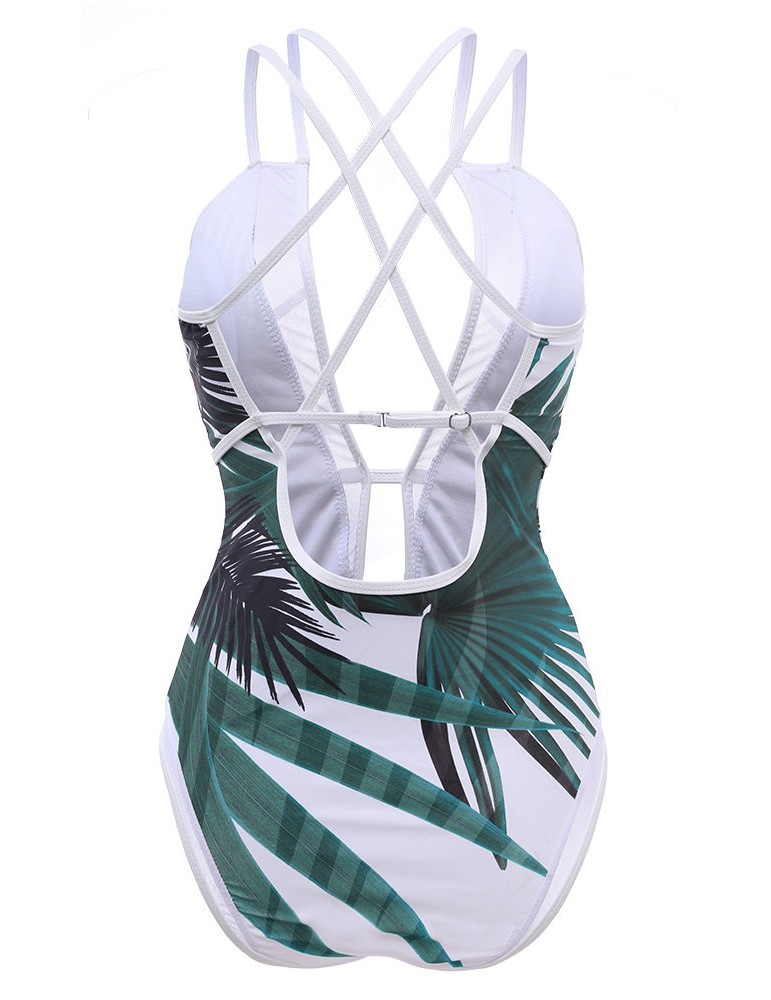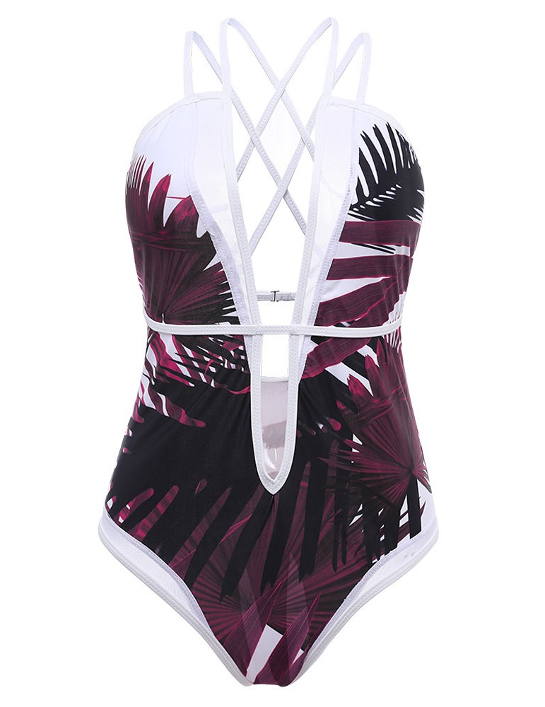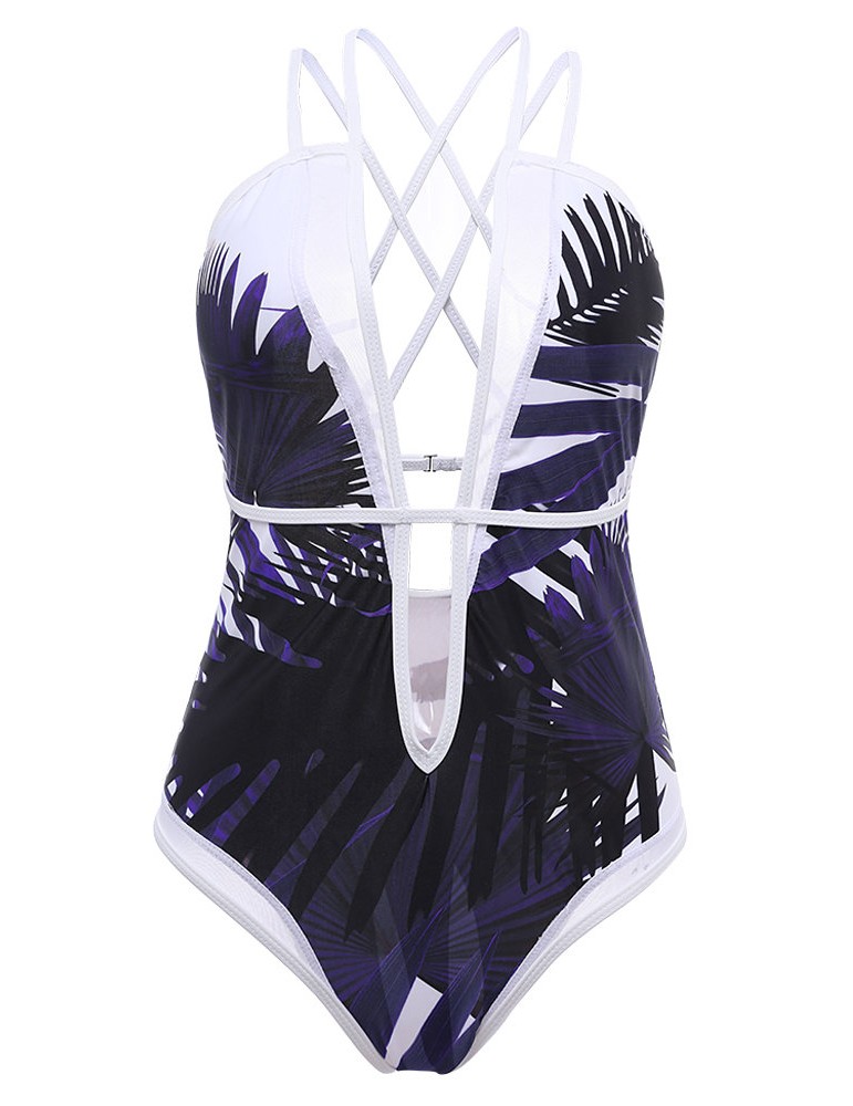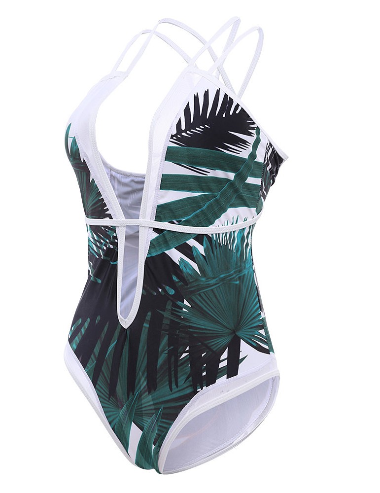 Sexy Deep V Palm Leaf Printed Strappy Back Monokini Swimsuit For Women