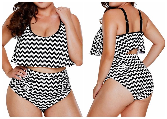 Plus Size Stripe High Waist Flounce Adjustable U Neck Backless Tankinis Swimsuits For Women