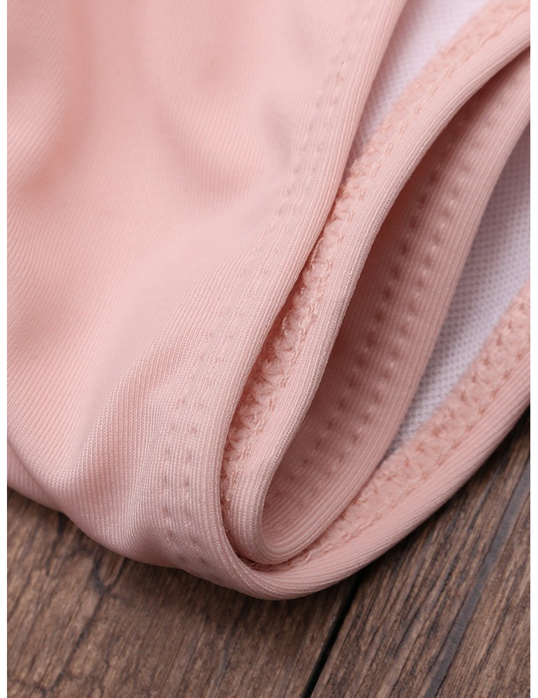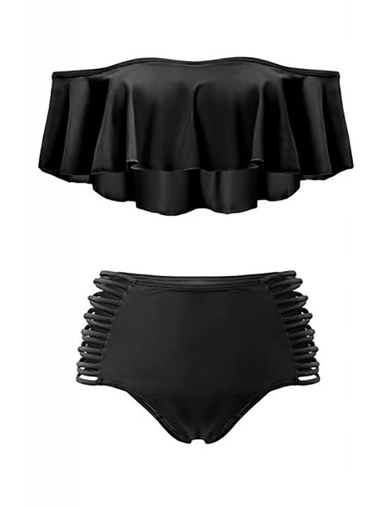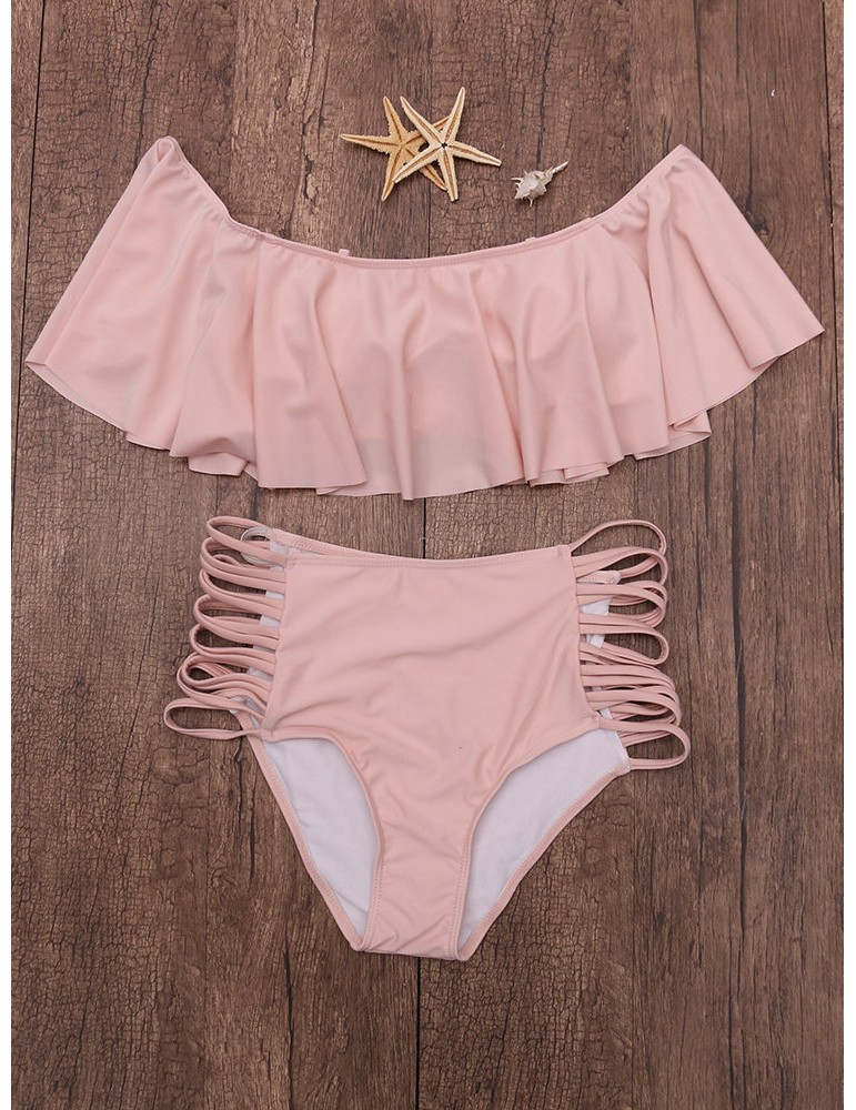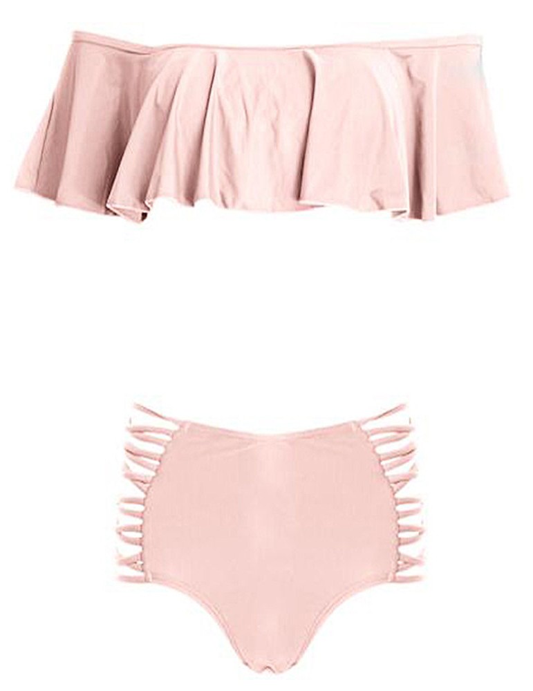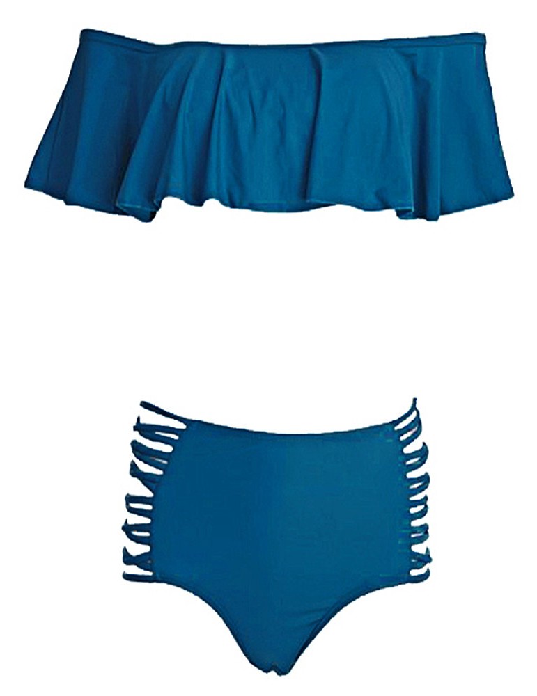 Solid Color Large Lotus Leaf Shoulder Wireless Tankini Swimwear For Women