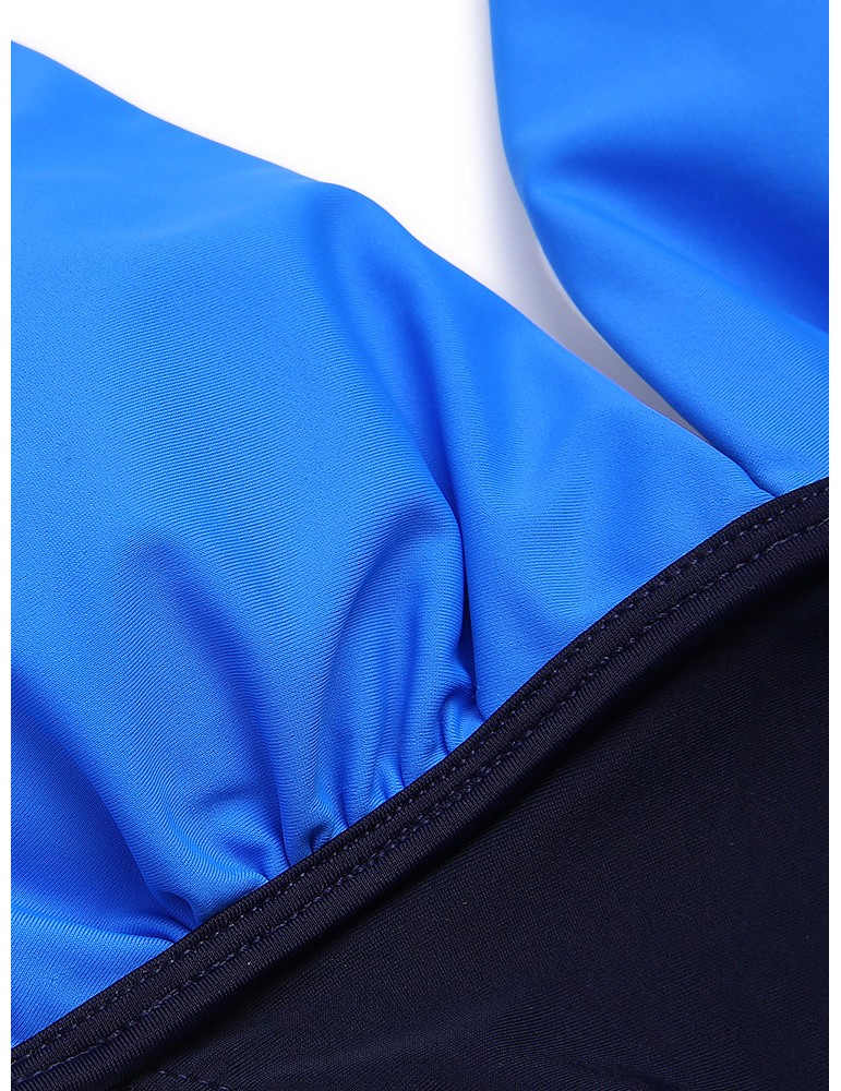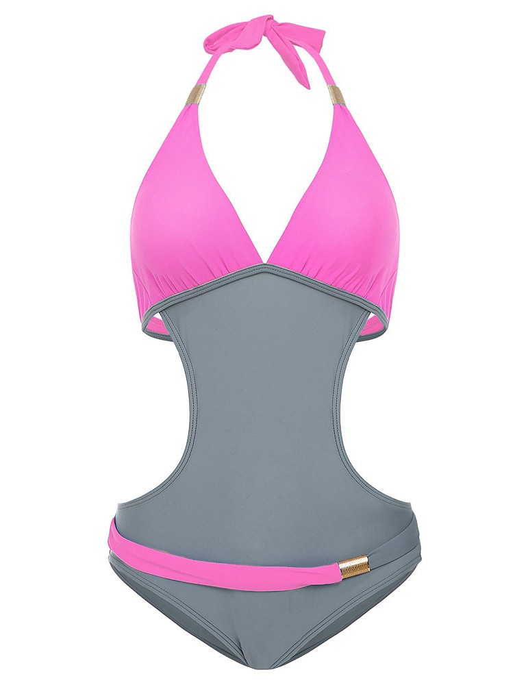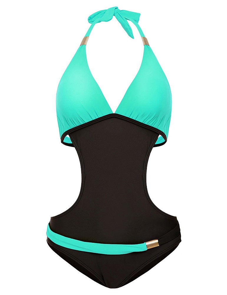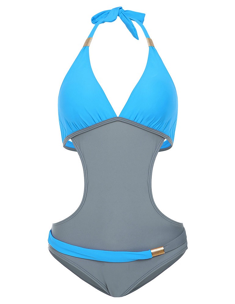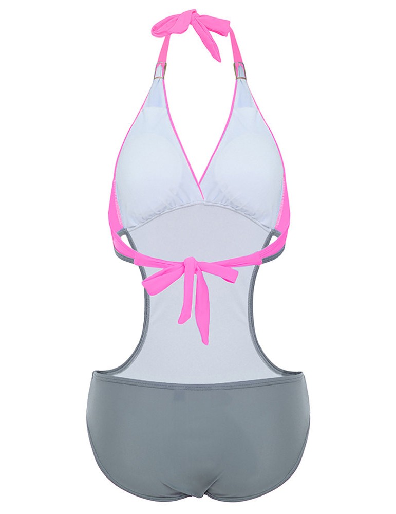 Sexy V-neck Halter Two-tone Patchwork Backless Wire Free Monokini Swimwear