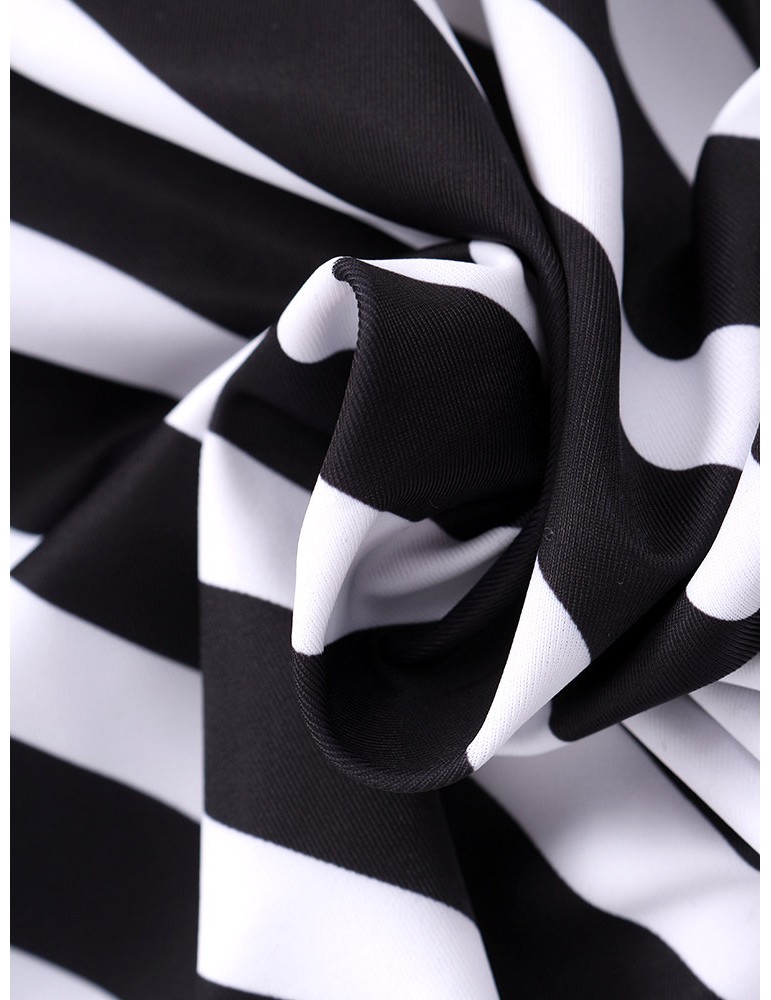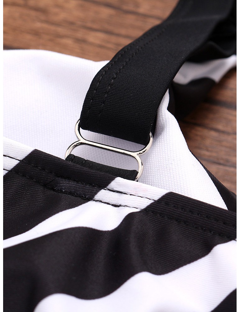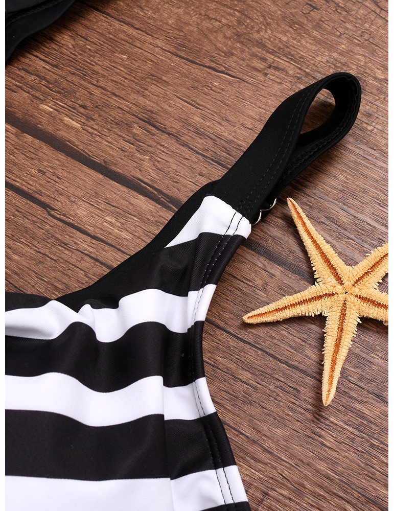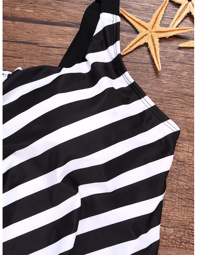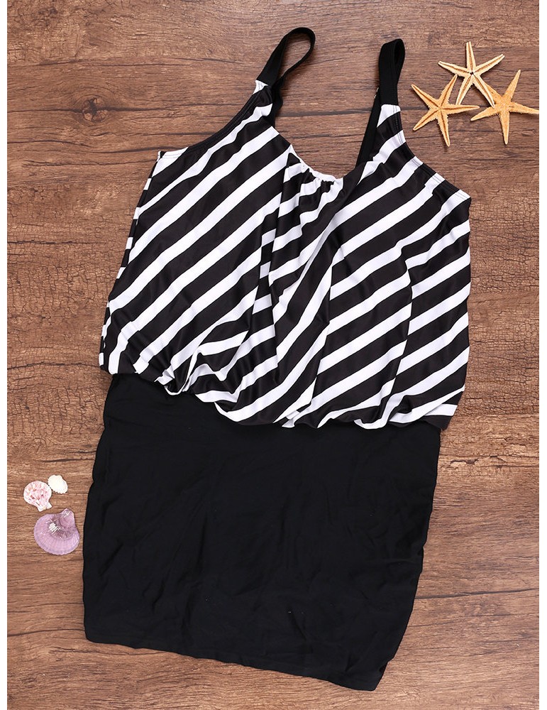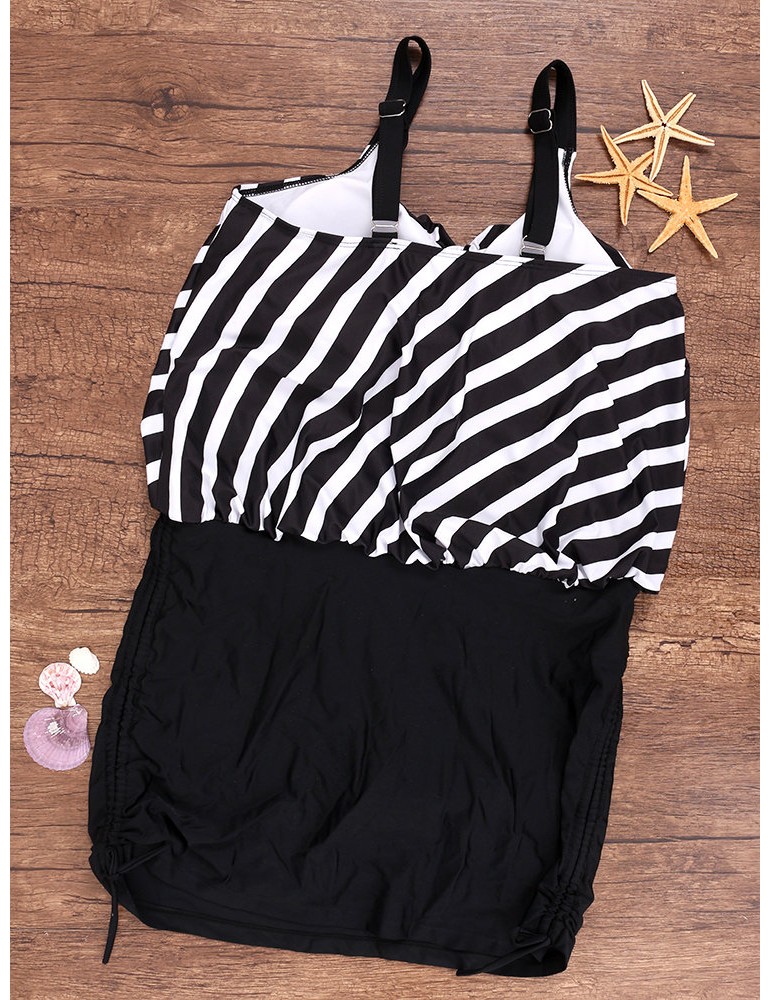 Plus Size Drawstring Boyshorts Black Striped Swimwear For Women