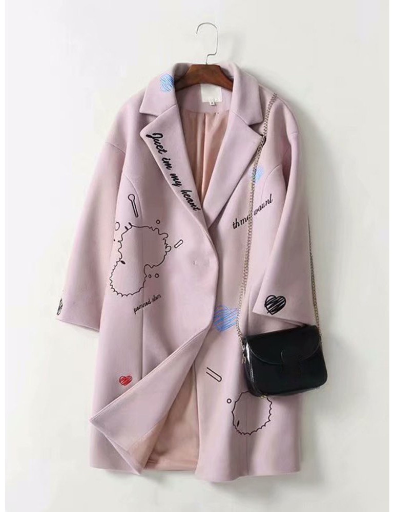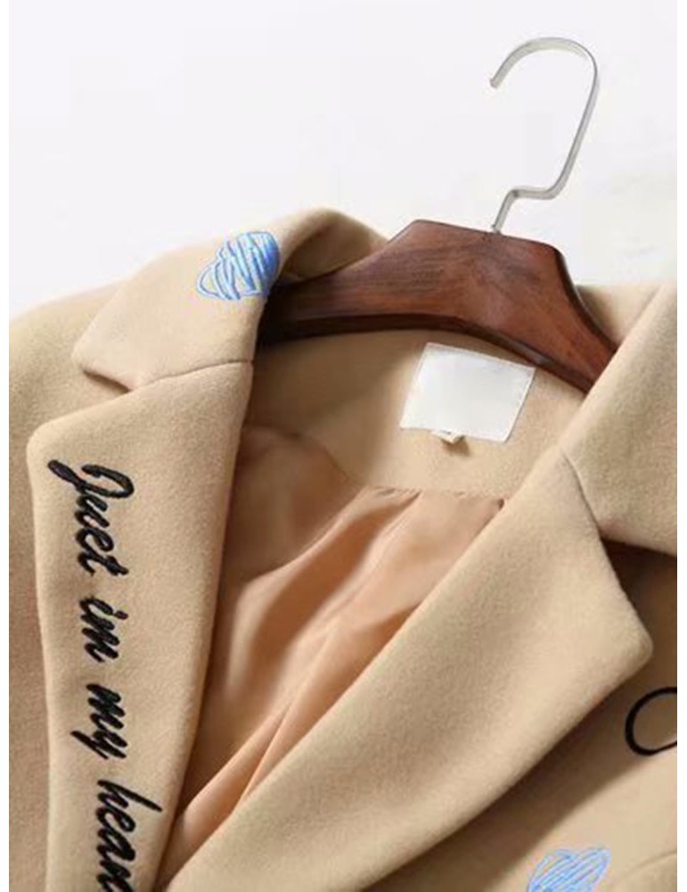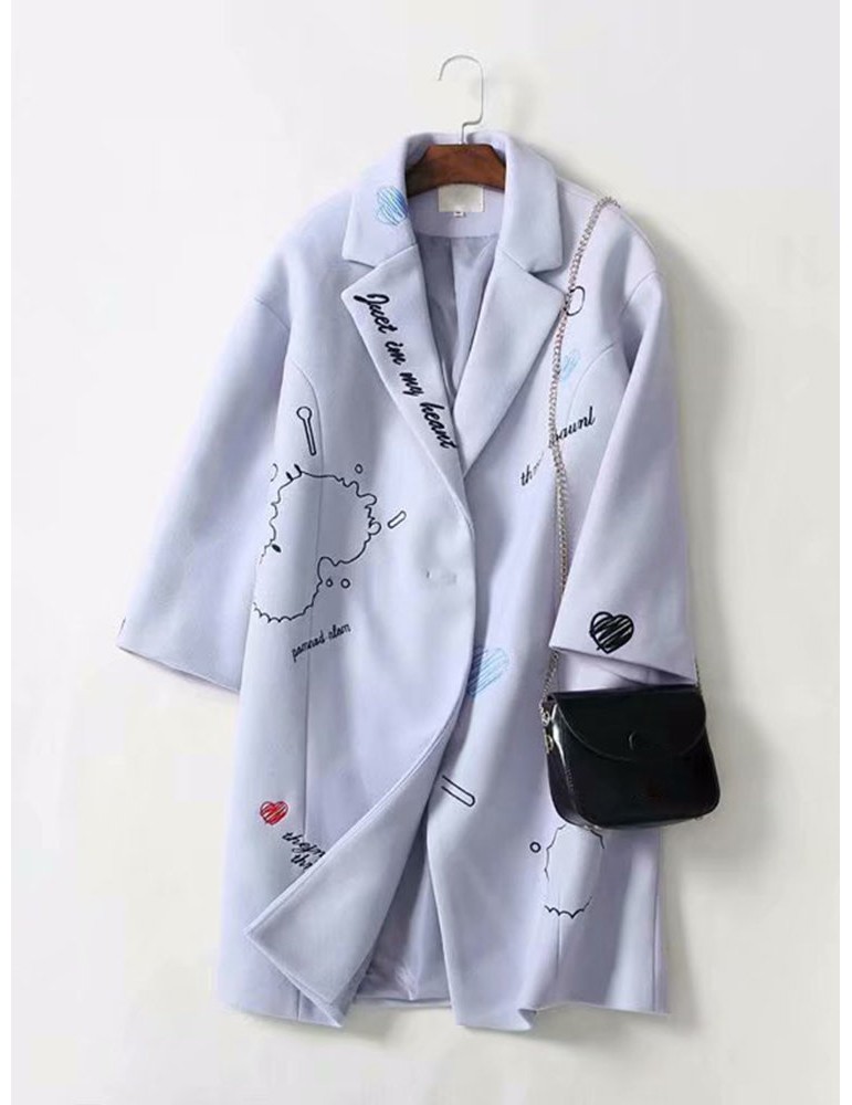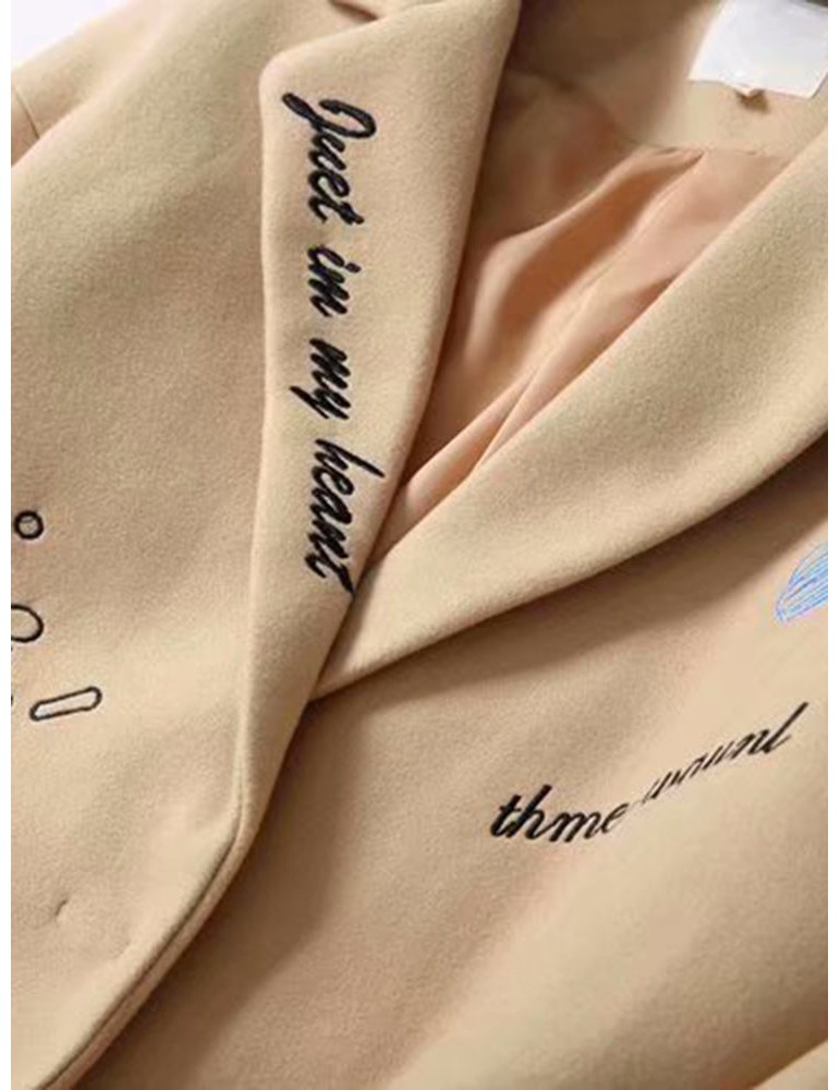 Cartoon Letter Embroidery Lapel Long Sleeve Women Coat