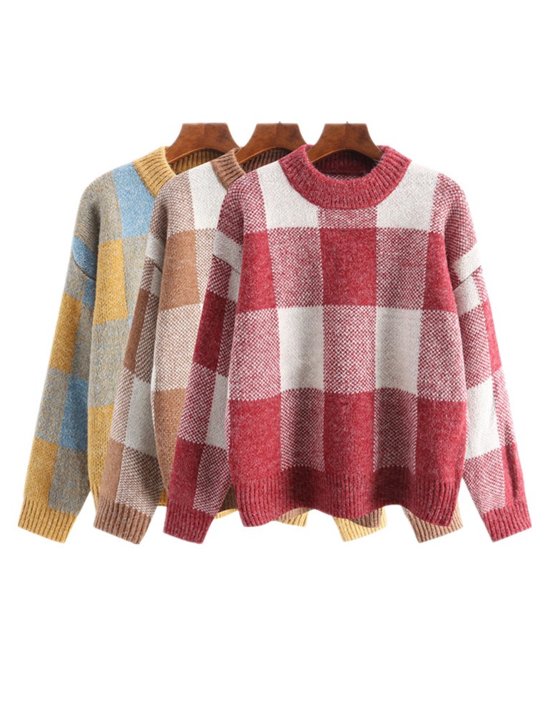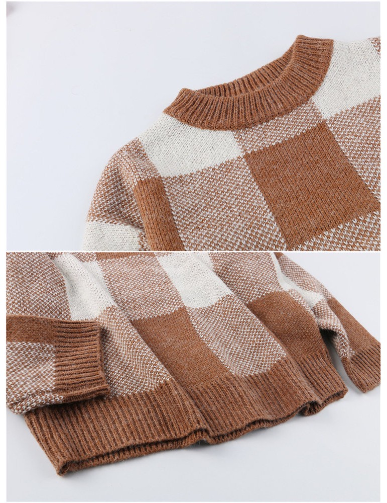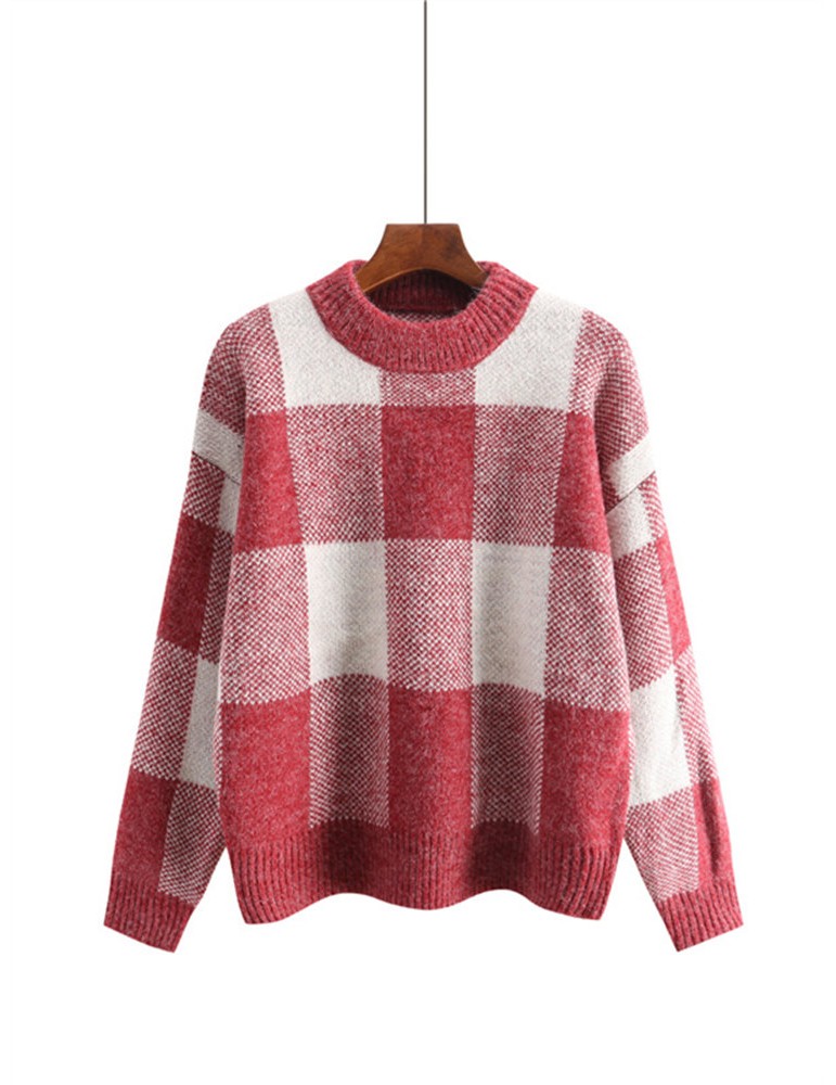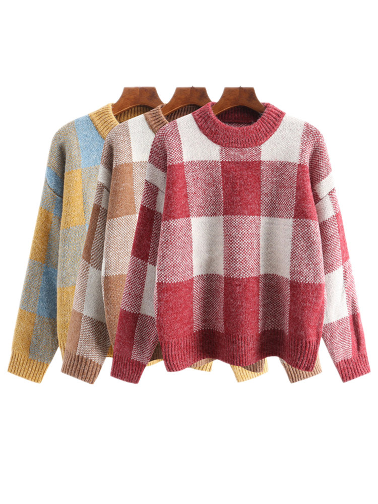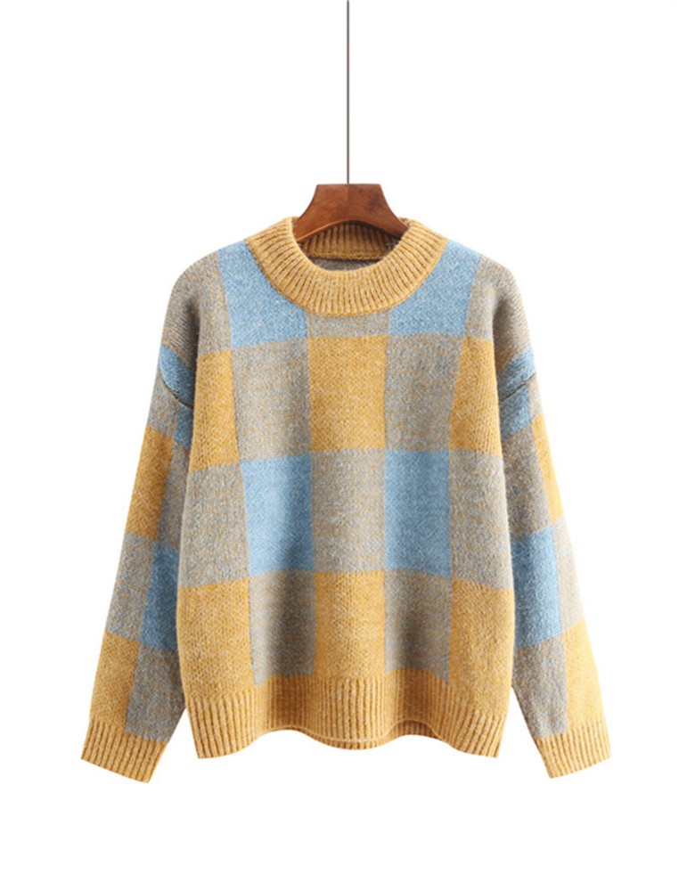 Long Sleeve O-neck Plaid Pullovers Sweater