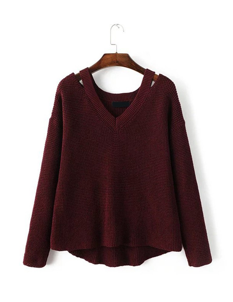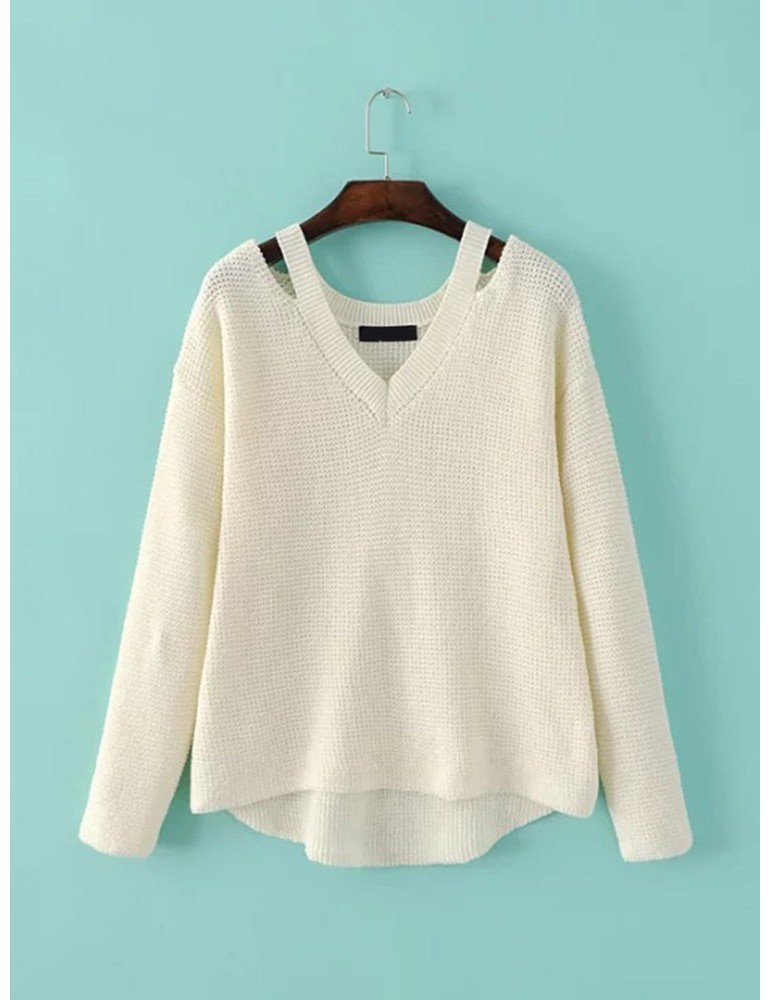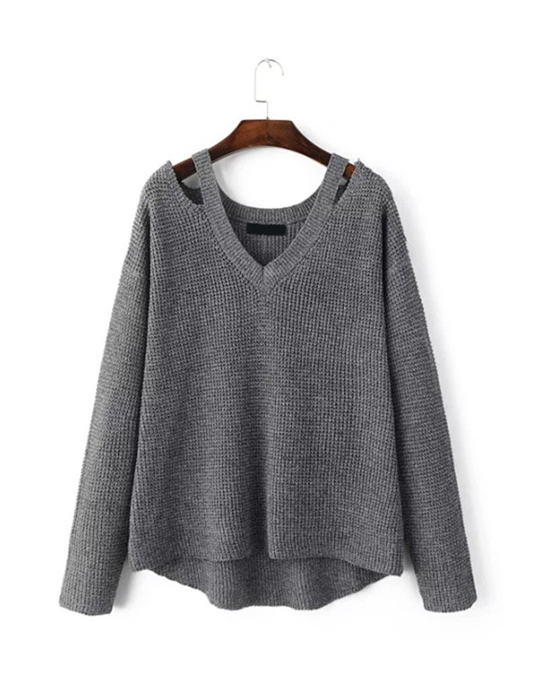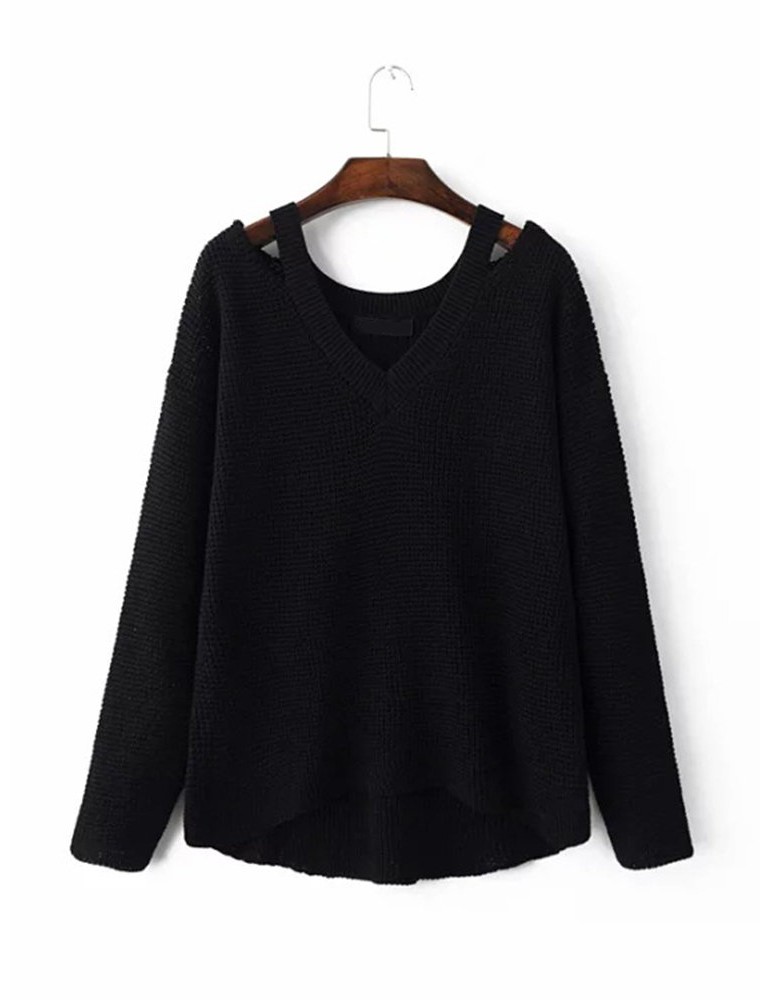 Women Casual Cold Shoulder Loose V-neck Long Sleeve Sweater
