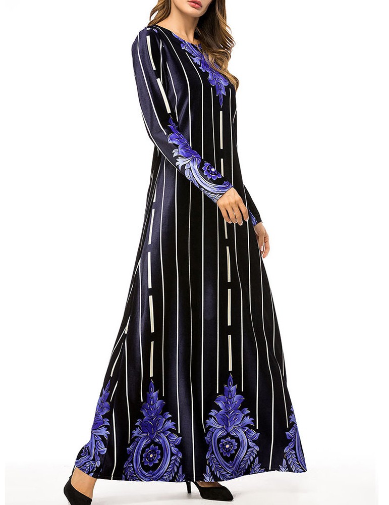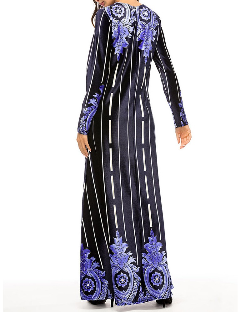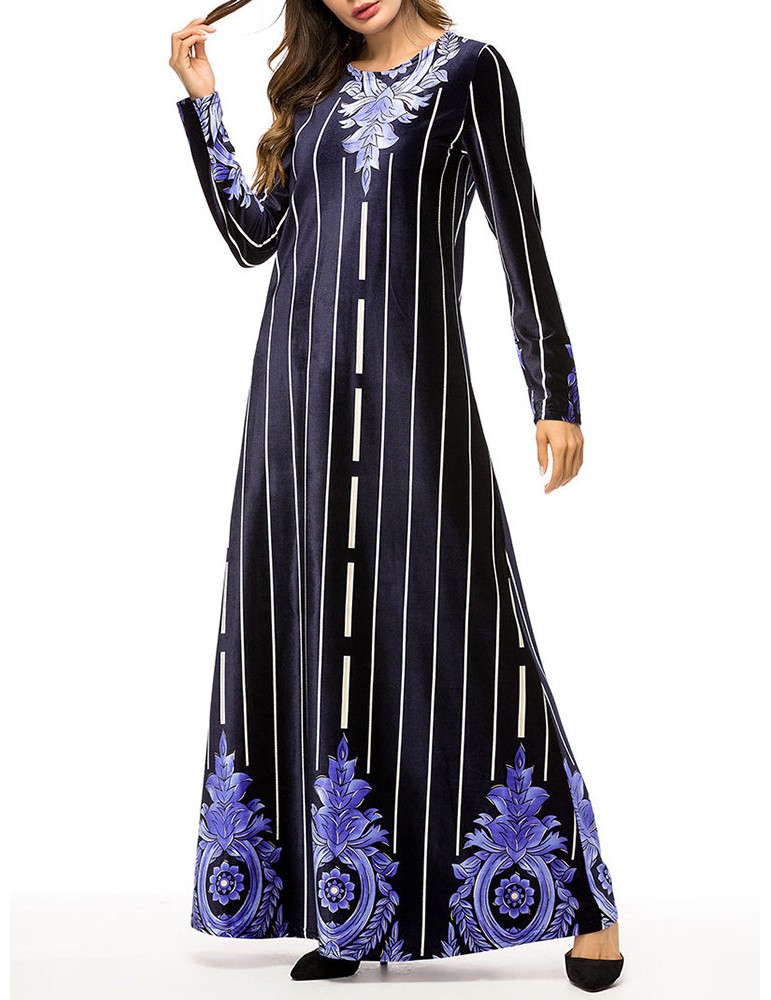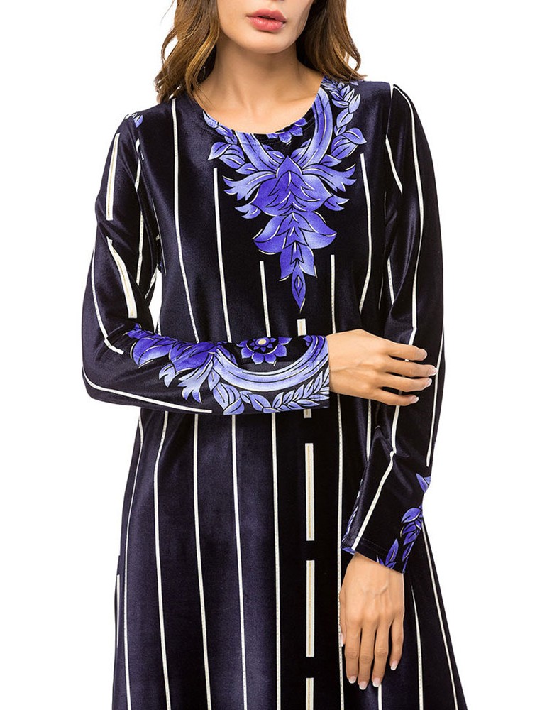 Muslim Velvet Striped Print Long Sleeve Long Dress